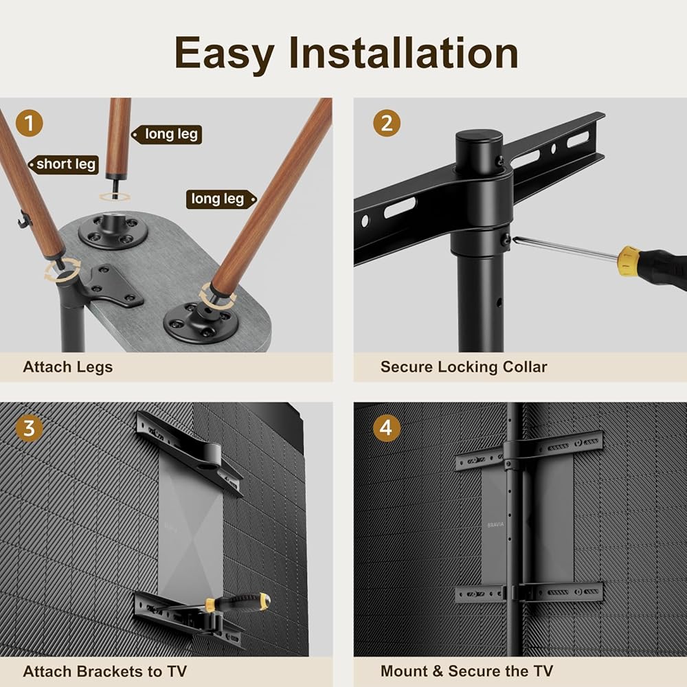 【Enjoy comfortable Views】By using the ergonomic height adjustment function, you can adjust the TV to the correct level for your eyes. This TV tripod stand's bracket allows for a 45 degree left and right swivel, which could prevent light reflections. An swievel TV stand is beneficial in preventing painful in your eyes and neck muscles for long time.