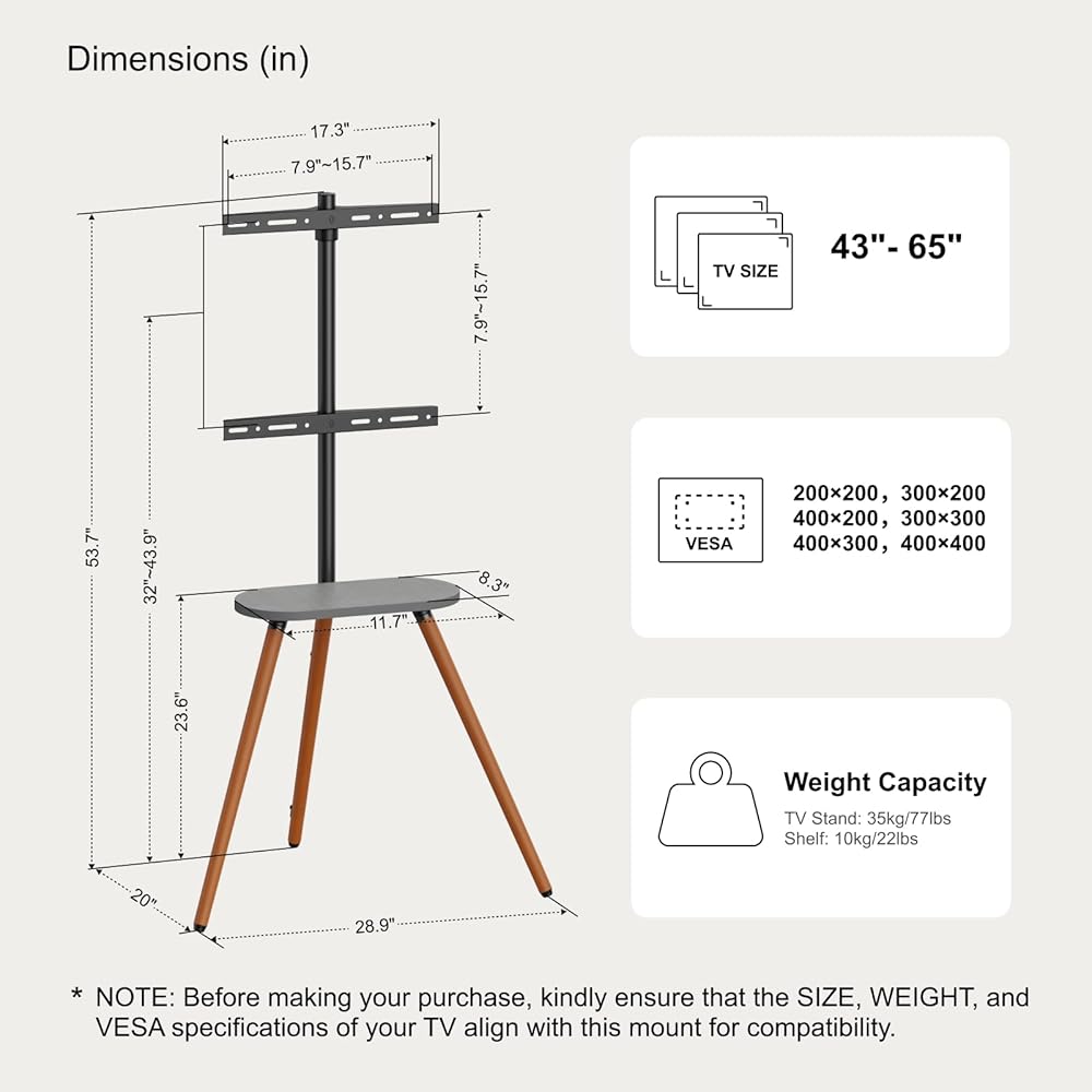 【Fits all Your TV's Size】This minimalist easel TV stand is perfect fit for 45''to 65'' inch LCD/LED TV screen. Whenever you upgrade your TV to a larger one, this TV stand will be with you every step of the way. It features a versatile VESA range, including 200x200, 300x200, 400x200, 300x300, 400x300, and 400x400mm. Make the smart choice for your home entertainment setup and experience the difference firsthand.
