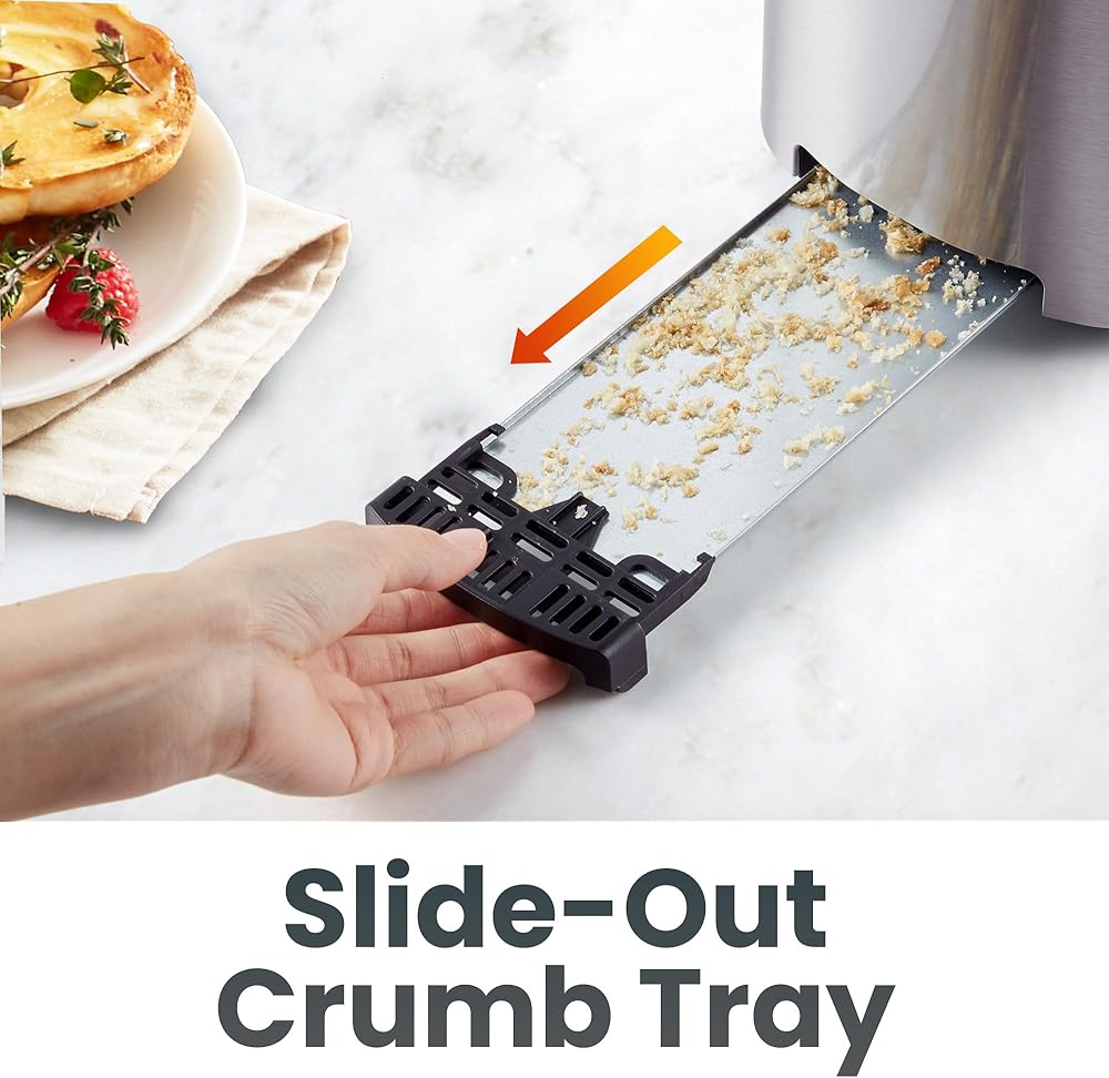 Introducing the Elite Gourmet ECT4123 long slot stainless steel toaster with a beautifully sleek, elegant profile. Great for large families with a 4-slice capacity and uniquely designed toasting slots to accommodate extra wide, long and tall specialty breads & bagels. The one-touch, easy to use control panel & toasting level dial makes selecting your desired function and toast shades easy. There are 6 variable browning shades easy so you can select the perfect level of color & doneness for your toast, from light to dark. We've included a True bagel function to toast the inside of sliced bagels while keeping the outside warm and soft, a defrost function to quickly thaw & toast frozen slices of bread and a reheat function to quickly reheat toasted breads without overcooking or burning. The toaster will automatically count-down ensuring perfectly toasted bread every time. Say goodbye to burnt or underdone toast and hello to hassle-free toasting. Keep your countertop tidy & catch crumbs & debris with its' easy to clean slide-out crumb tray. Enjoy convenient storage and a cord free counter by using the convenient cord wrap. Enjoy the convenience and ease of toasting and warming your favorite foods for breakfast, lunch, or a quick snack!
