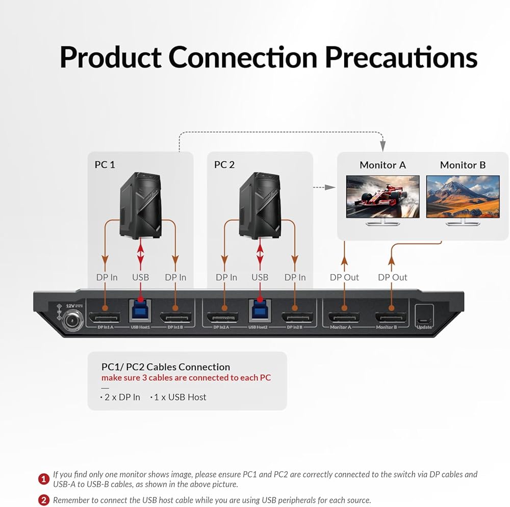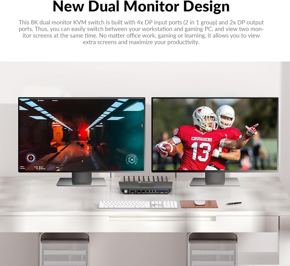 Dual Monitor DisplayPort KVM Switch 2 IN 2 OUT: Control 2 computers for Windows, Mac, Chrome and Linux with one set of wired or wireless keyboard, mouse and 2 extended or mirrored monitors at the same time.