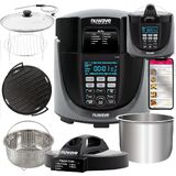 WHAT'S INCLUDED: air fryer lid, pressure cooker lid, slow cook lid, 6 qt. stainless-steel inner pot, 4 qt. SS air fry basket, reversible cooking rack, digital temp probe, grill plate, water-collection tray, lid holder. Additionally, you'll find a manual, a quick start guide, a recipe book with 60 recipes, and access to NuWave Cooking Club App