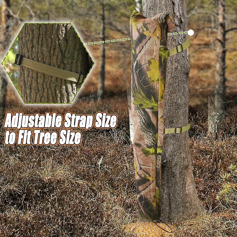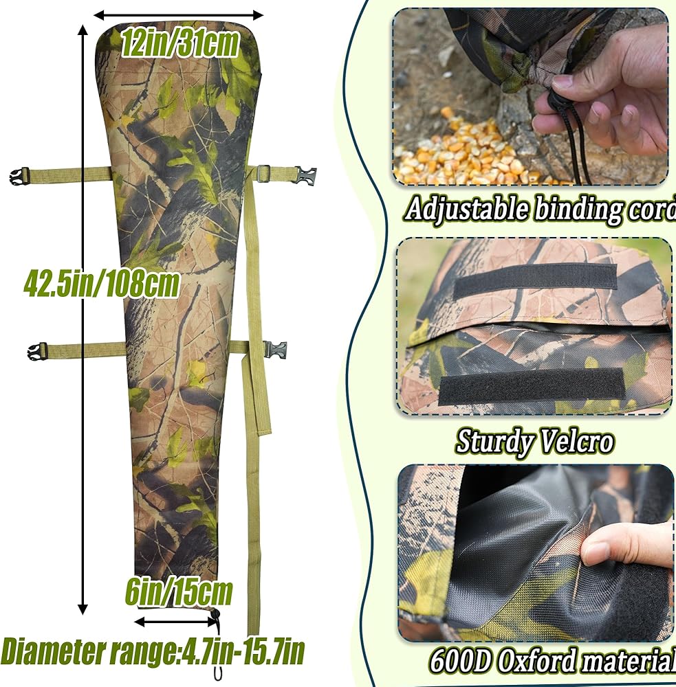 • Large capacity design:The feed bag is lightweight and compact, printed with camouflage map on the surface, size: 47×11.8× 5.9 in, can be filled with corn, bran, protein particles, powder attractant, etc.