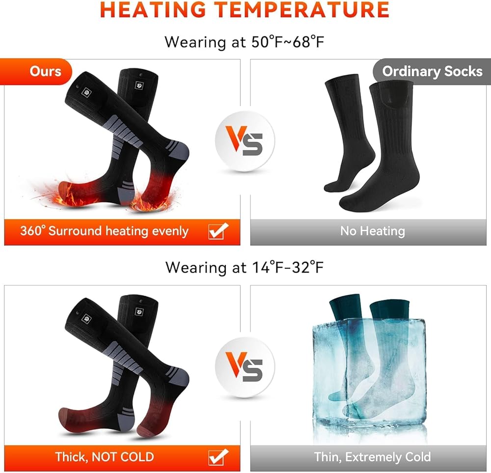 ✽【360° Even Heating】Our Upgraded electric socks replace the traditional heating wire with a heating sheet,which has a larger heating area. The heating is even, won't burn your feet and promote blood circulation. It is helpful for outdoor sports enthusiasts, people who are afraid of cold, arthritis or Raynaud's syndrome.