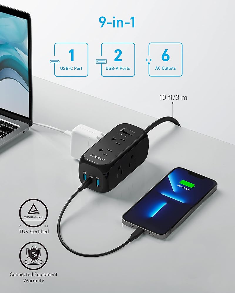 Power Up to 9 Devices: 6 AC outlets, 2 USB ports, and 1 USB-C port power everything on your desk from a single compact device.