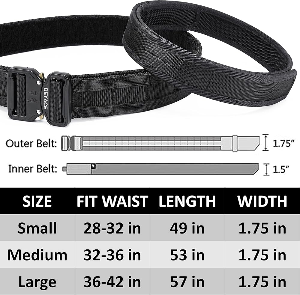 Dual Belt Set: DEYACE battle belt molle set includes a 1.75'' outer belt and a 1.5'' inner belt, both of which can be used separately or as a set. The inner belt is made from special material that won't stick to clothing or grass, provides a comfortable and neat fit through your pants belt loop and becomes a stable attachment platform for the outer MOLLE belt.