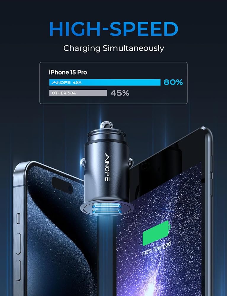 4.8A/24W EFFICIENT CHARGE: AINOPE car charger can reach maximum output of 2.4A/12W per port, which the charging speed is 2X faster than 1A/5W. With 4.8A total power, this dual USB cigarette lighter adapter enables you to charge two devices simultaneously at full speed with 2.4A per USB port. Please note: it does not support Qualcomm Quick Charge. The charging page WILL NOT show fast charge when charging.