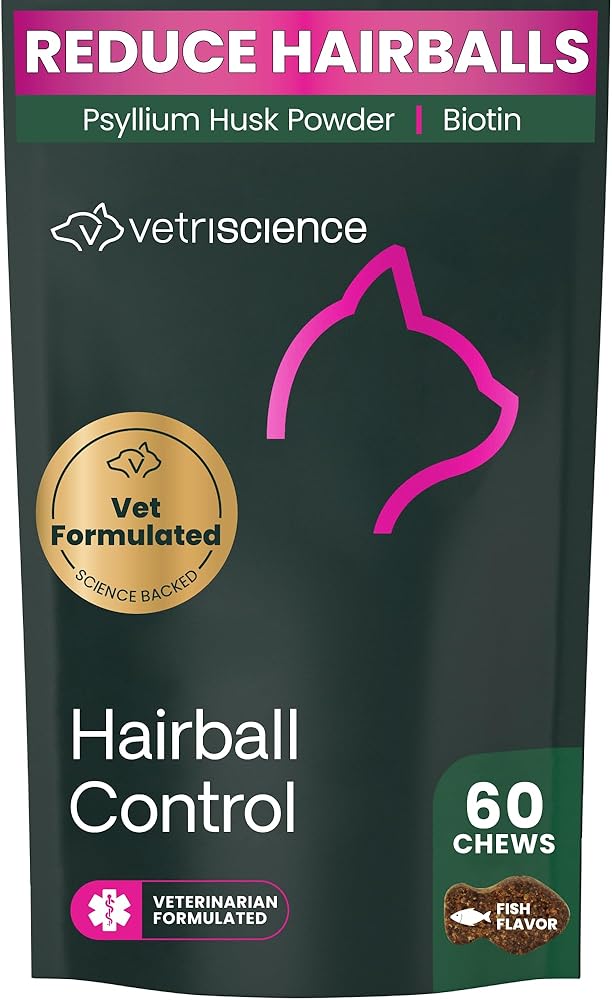 Vetri Hairball offers an easy way to help manage shedding and normal digestive issues that are related to hairball issues in cats. Dual action is the key to this formula. The chicken liver flavored soft chews contain omega fatty acids which provide essential fats for skin and coat health while also supporting the lining of the GI tract. Added Psyllium promotes healthy movement and function through the GI tract. Lecithin, Biotin and Zinc are nutrients that support elasticity and moisture to the skin for healthy coat growth. A healthy coat is a key factor in managing unwanted shedding that can end up as uncomfortable hairball issues for your cat.
