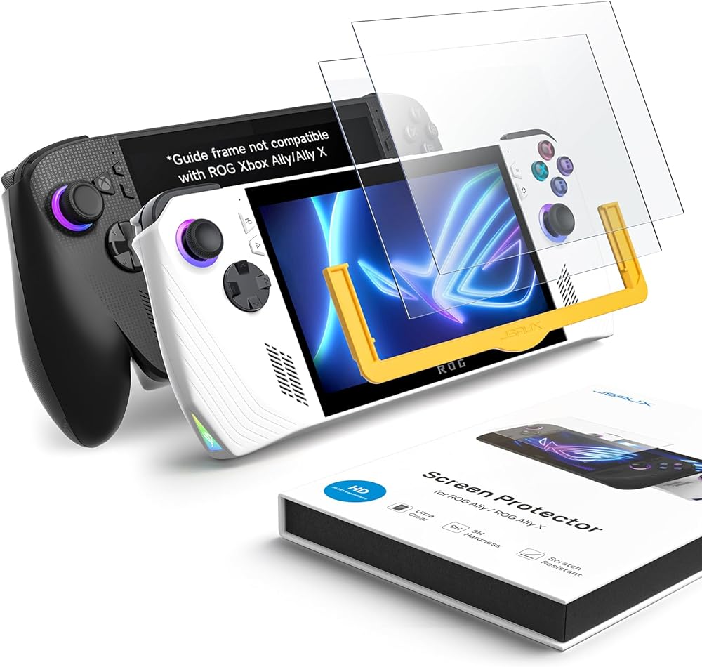 What You Get: You will get 2 * JSAUX tempered glass screen protector for ROG Ally, 1 * Guiding frame, Cleaning wipes, Dust sticker, Microfiber cloth, Squeeze card, Easy installation manual