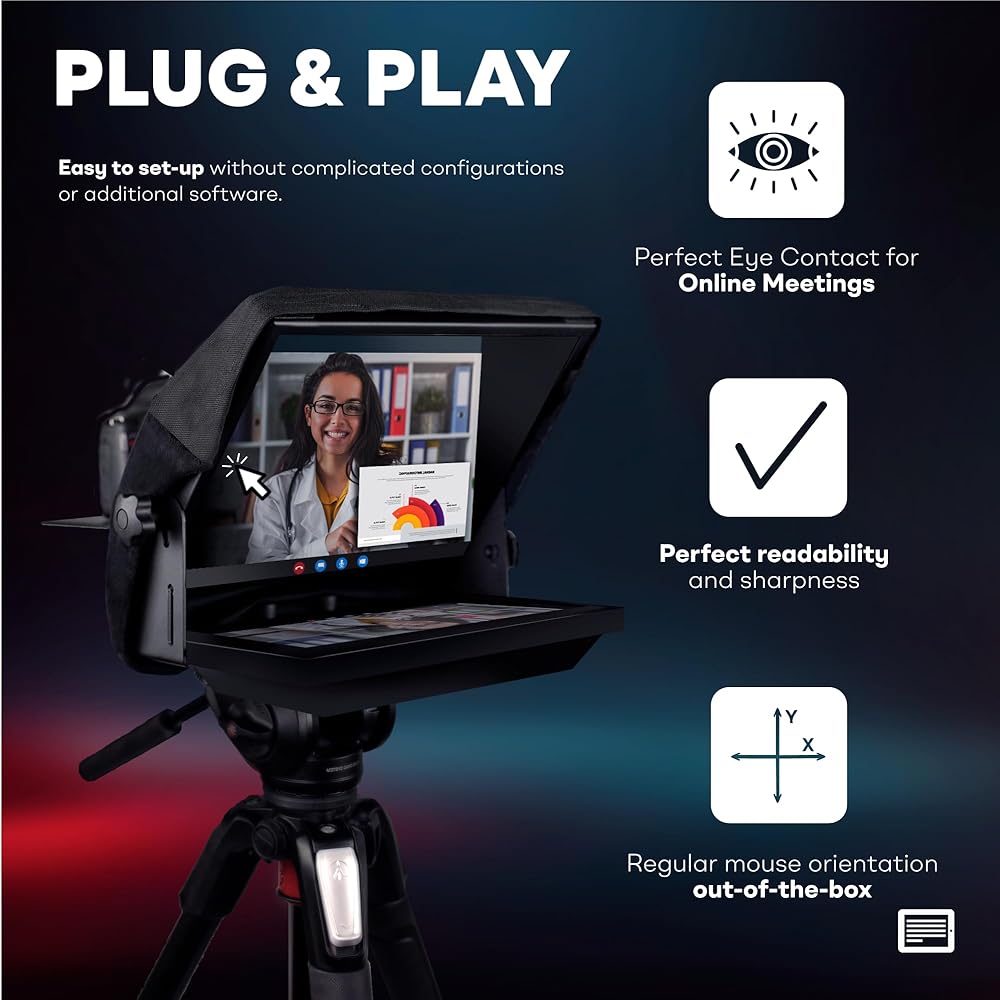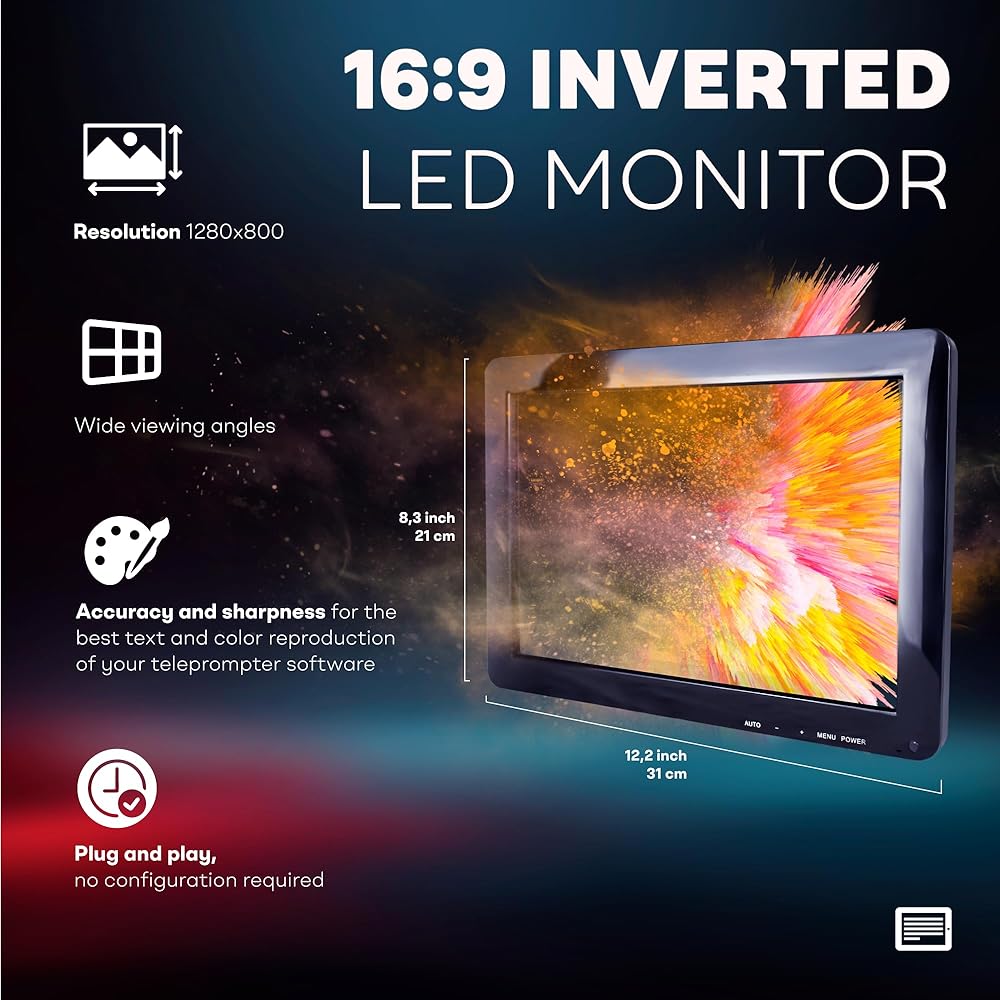 Elevate your teleprompter setup with the Inverted Monitor for iLight PRO 14", specifically designed to provide a user-friendly and efficient viewing experience for teleprompter applications. This plug & play teleprompter screen offers hassle-free operation straight out of the box, making it perfect for seamless teleprompter functionality with no complex configurations. Designed specifically for the iLight PRO 14" teleprompter and compatible with any teleprompter setup that fits a monitor with dimensions 31x22x6cm, it ensures a perfect fit for various teleprompter models. Enhance your live streaming, YouTube video production, TikTok content creation, and professional presentations with this inverted teleprompter monitor. Enjoy intuitive navigation for online meetings and script filming with right mouse orientation – no additional gear required. The versatile connectivity options include HDMI teleprompter connection, VGA teleprompter hookup, and composite video teleprompter integration, offering flexibility for diverse teleprompter setups. Ideal for professional broadcasters, vloggers, social media influencers, and anyone looking to improve their teleprompter experience, this monitor is a must-have for enhancing workflow and production quality. Whether you're creating content for YouTube, TikTok, Instagram, Facebook Live, or conducting webinars, Zoom meetings, and online classes, this teleprompter display will significantly improve your setup. Optimize your teleprompter experience with the Inverted Monitor for iLight PRO 14" – the perfect solution for content creators, video marketers, and anyone serious about professional teleprompter use.