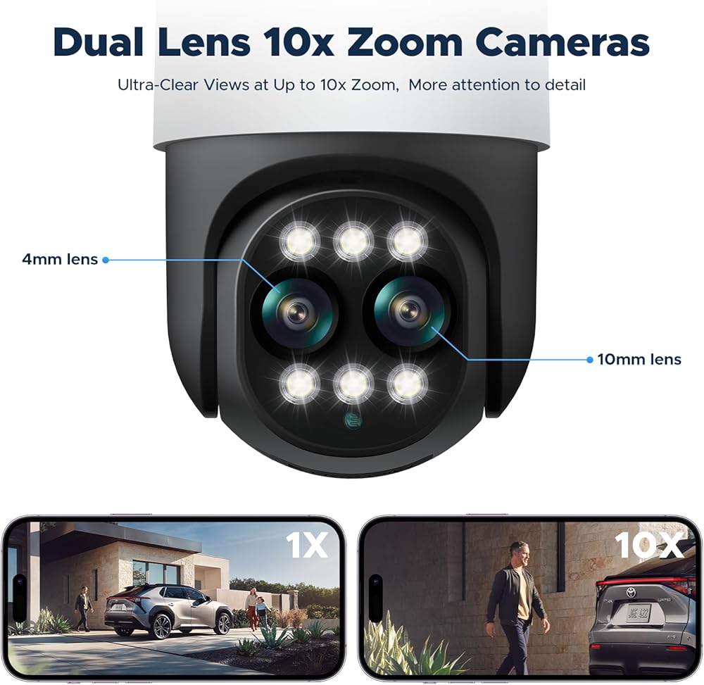 DUAL LENS 10X HYBRID ZOOM: Mind-blowing 10X PoE security camera system becomes affordable for your home and business security, giving you peace of mind with a wide field of view and clear close-ups. You'll see more detail in your security camera images, and small objects become larger and clearer in your field of view