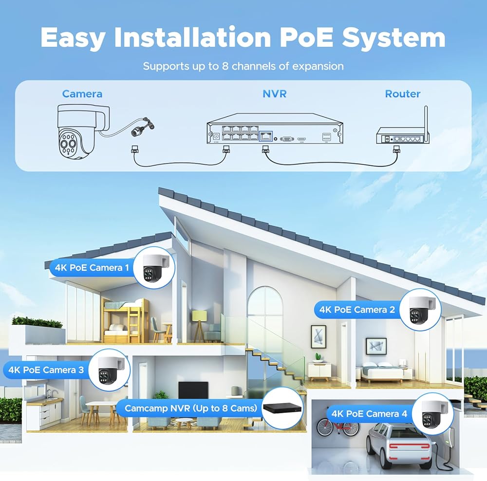 8MP UHD IMAGE & COLOR NIGHT VISION: Wired security camera system with 4Pcs 8-Million-Pixel PTZ cameras and high tolerance CMOS, this camera provides clear viewing on your security system. Providing you with full color night vision even in low light conditions, it makes it easier for you to read the license plate of an intruder within 100 feet of the camera's field of view, protecting your home and property