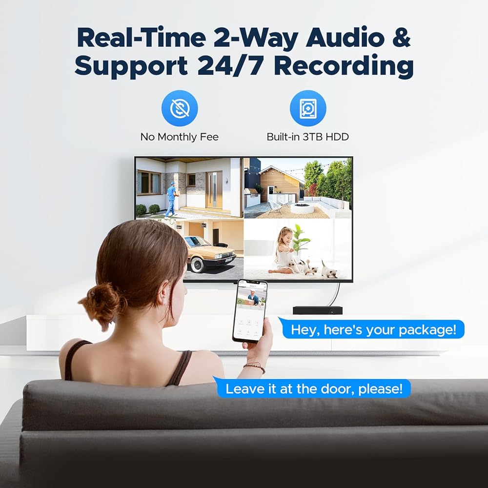 24/7 RECORDING: Upgraded H.265+ technology takes up less storage space without compromising image quality, resulting in longer recording times. The pre-installed 3TB hard drive ensures over 160 days of recording in 24/7 recording mode for your CCTV camera security system needs, No Monthly Fees