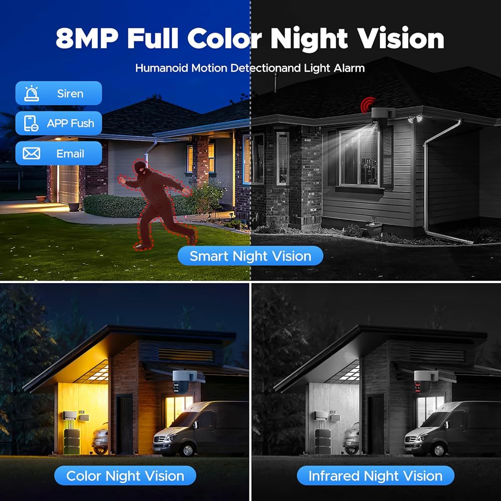 SPOTLIGHT & SIREN ALARM: The security camera outdoor system with a spotlight alarm and sound alarm function, when suspicious motion is detected at night, the security cameras wired outdoor will automatically turn on the powerful spotlights and siren alarm to help you deter intruders