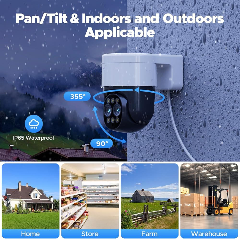 PAN/TILT CONTROL AND MOTION TRACKING: The PTZ security camera systems rotate in all directions to avoid surveillance dead spots - 355° horizontally and 90° vertically, providing a 360° panoramic view that allows you to track suspicious people and record their every move, so you don't miss any important moments. You can control the camera lens orientation from your phone anytime, anywhere. Perfect for home, office or even garage use