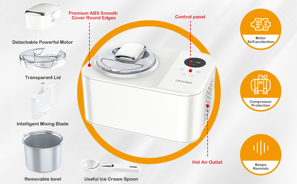 🍦[التجميد الذاتي والتصنيع السريع] يمكن استخدام ضاغط قوي مدمج بقدرة 110 وات لآلة صنع الآيس كريم UKKISO سعة 1.2 لتر بشكل مستمر دون التجميد المسبق. استمتع بالآيس كريم واللبن الزبادي والشربات والجيلاتو والحلويات اللذيذة في ساعة واحدة فقط