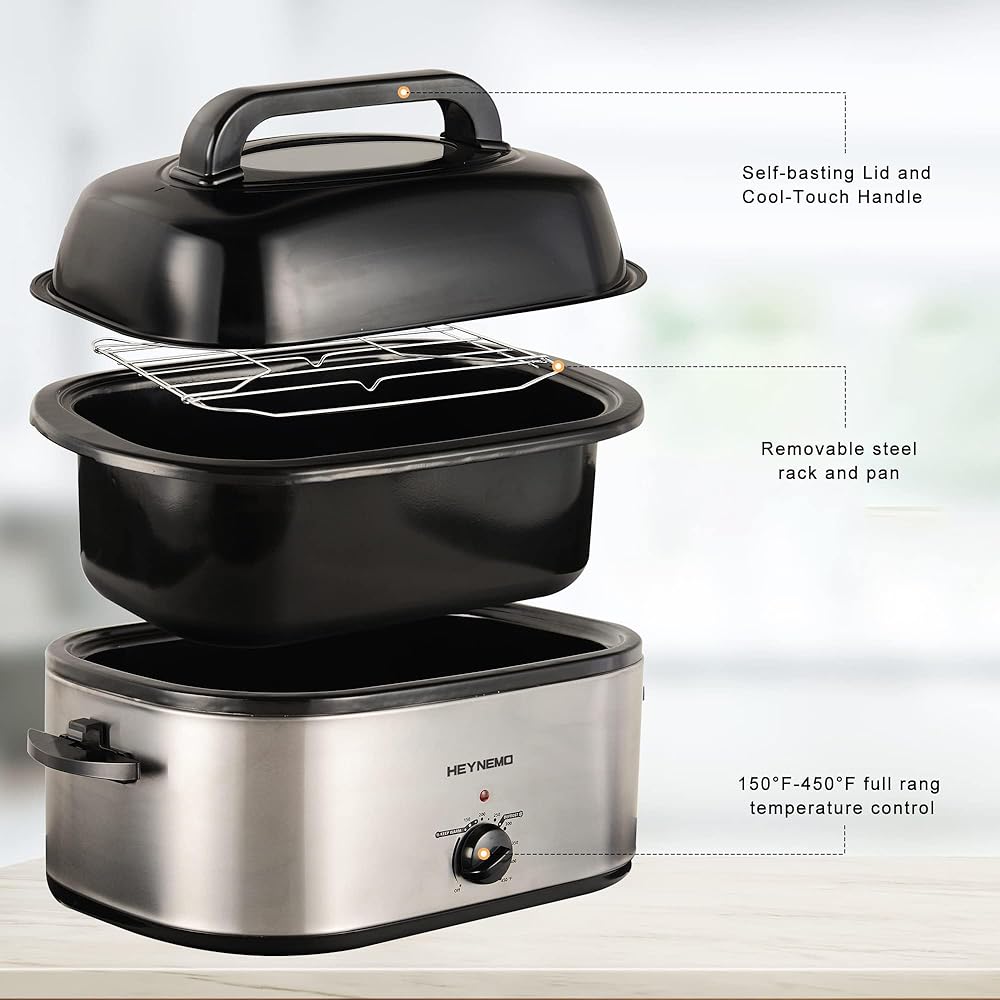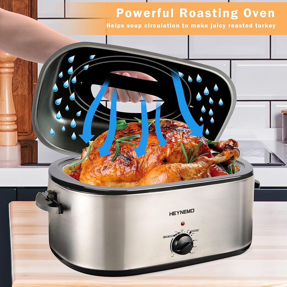 【Making a Great Meal Easily】24qt electric turkey roaster fits a 28 pounds turkey,1450W and full-range temperature control(150º to 450ºF), our electric roaster takes less time to cook than a oven. Perfect for the holidays, parties, or anytime you're feeding a large crowd.