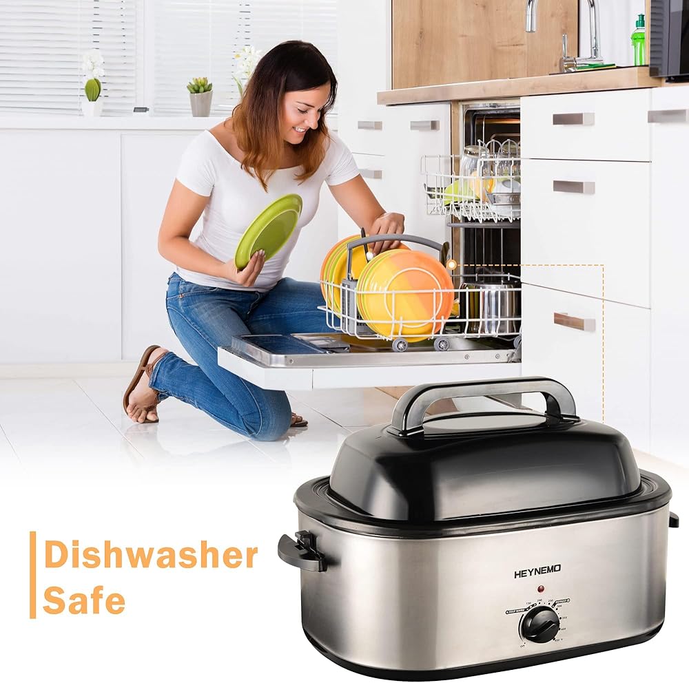 【Convenient Design】Stainless steel roaster is equipped with a removeable liftable rack, help you put the turkey in and out of the oven easily, and ensures that the crispy skin of the turkey will not be damaged after cooking. Roaster pan, lid and rack are dishwasher safe, enjoy easy kitchen life.
