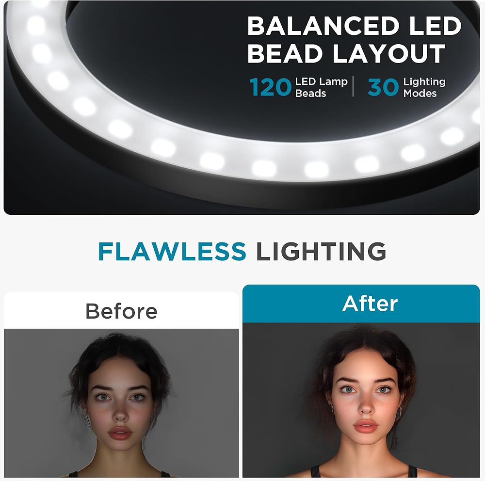 Transform your content creation experience with InnoGear Selfie Ring Light with Arm Stand, designed to deliver unparalleled lighting and versatility. Featuring 30 lighting combinations, you can effortlessly switch between white, natural, and warm tones, with 10 brightness levels for each mode. Whether you're creating captivating videos, taking stunning photos, or setting up a cozy ambiance, this ring light adapts perfectly to your needs, ensuring flawless results every time.