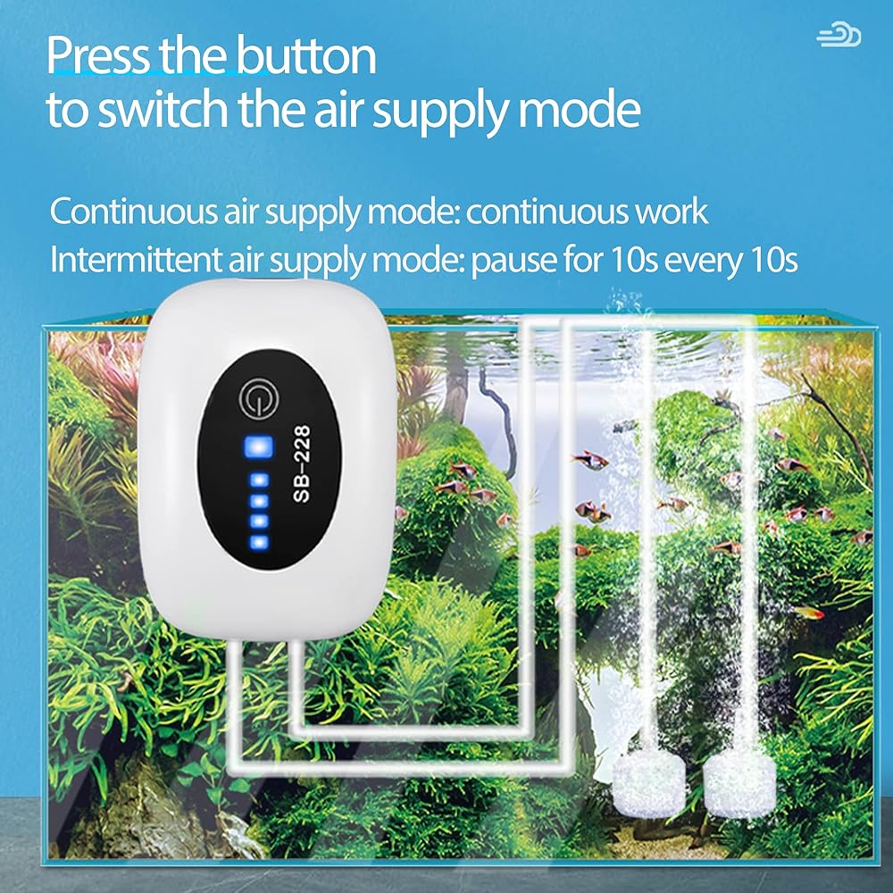 💨【Strong Air Volume】The air pump can produce a large amount of aeration and provide sufficient air circulation in the fish tank. In continuous air supply mode, this air pump will continue to produce bubbles. The air flow can reach a maximum 3L/min. The air pressure will be 0.018 Mpa. In interval air supply mode, this air pump will pause for 10 seconds every 10 seconds, to save energy and prolong usage time.