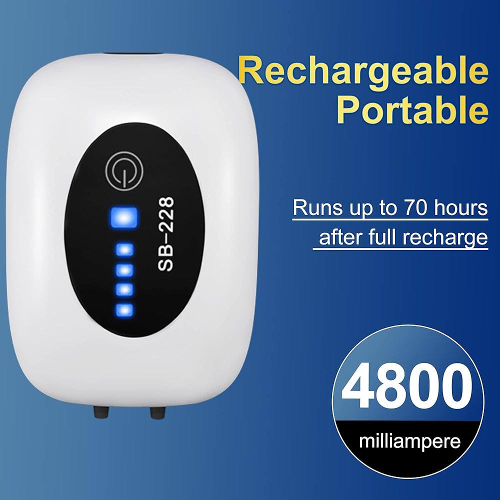 ⚡️【USB Rechargeable】 Up to 70 hrs. Build-in 2600 mAh rechargeable lithium battery provides up to 70 hrs working time (interval mode). So it will be suitable for outdoor fishing, fish transportation and power outages, etc. You can charge it with devices with a USB interface, such as a power bank, a laptop, a car cigarette lighter, or a wall charger.