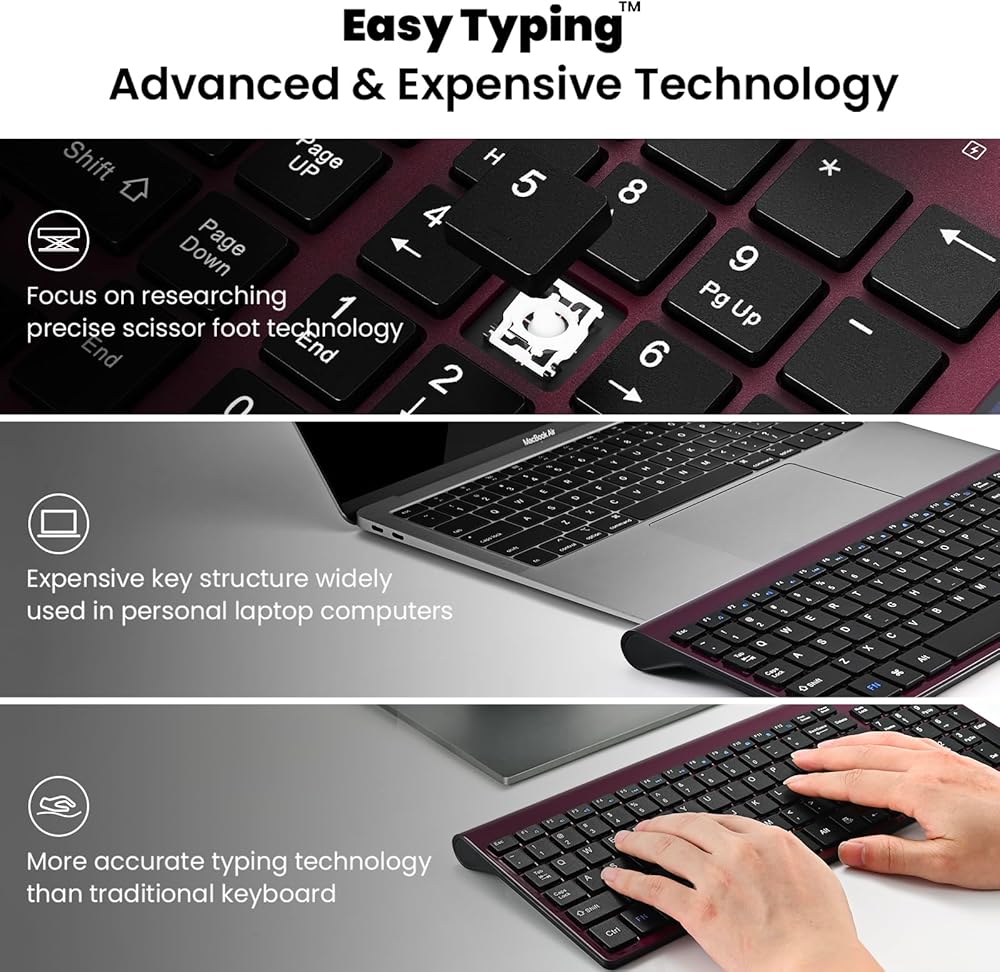 【Ultra-Slim and Portable Design】Wireless pc keyboard has 14.5x5.4x0.8in(36.8*13.6*2.0cm), 0.8in(2cm) ultra-thin ABS plastic body, which can save space and easy to carry. Kit keyboard and mouse wireless's sleek design is super match with office desk. Perfect for business travel, office, home, library and many public occasions.