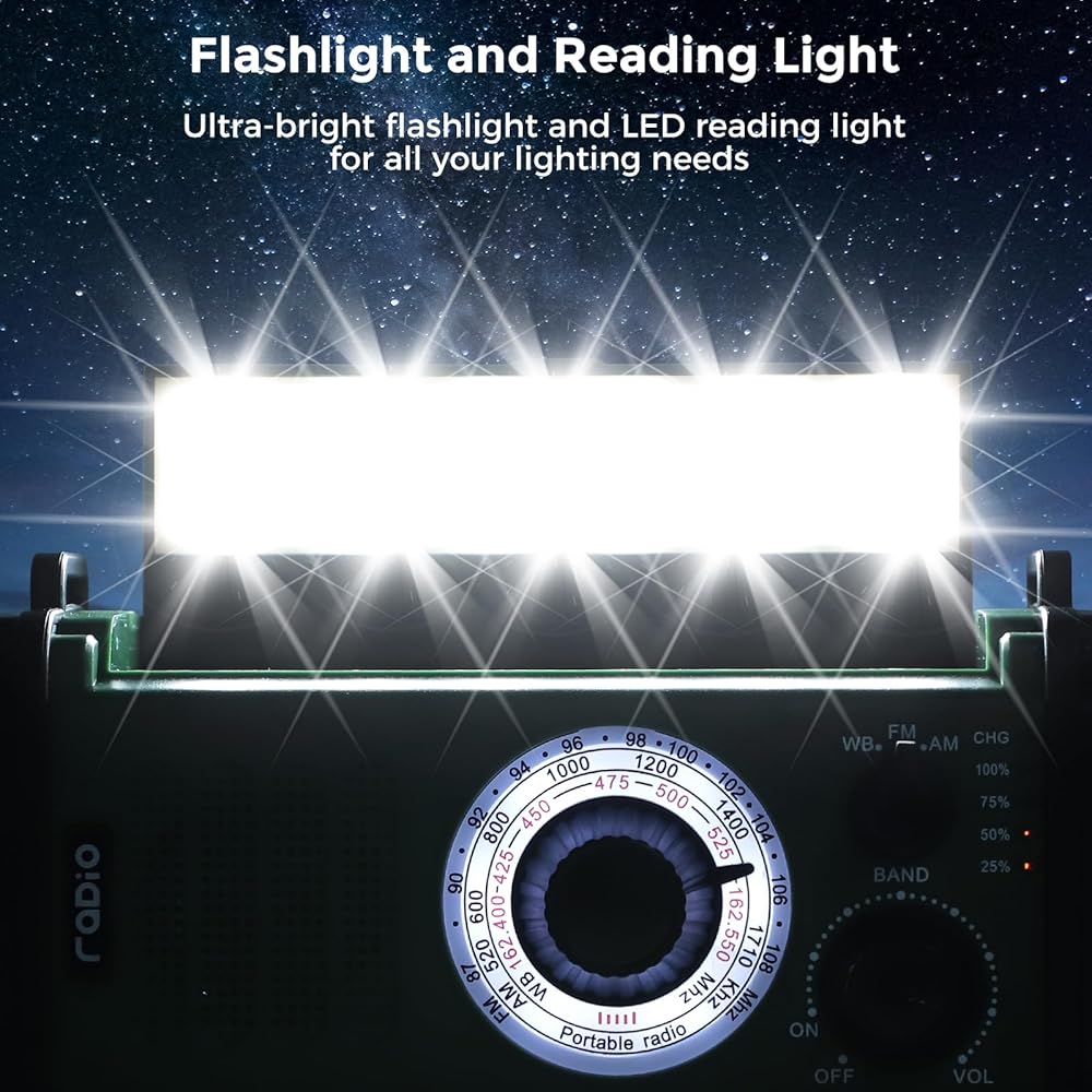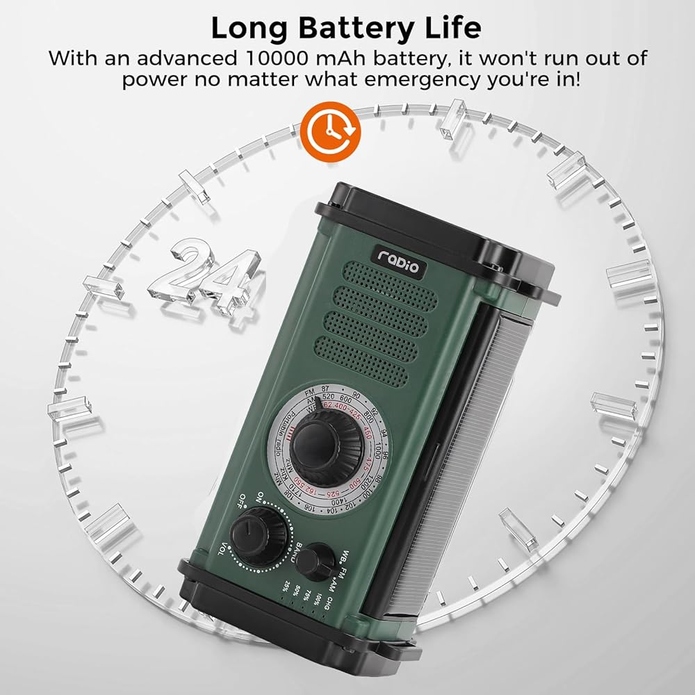 【10000mAh Super Large Battery】 Have you ever been trapped in a hurricane? No electricity and signal. Life is full of uncertainty, but we can be prepared. Our emergency radio is equipped with an advanced 10000 mAh battery, which can play 40 hours of radio, run the flashlight for 50 hours, and fully charge two smartphones. This emergency weather radio can provide enough emergency power to make important calls to family members, emergency services, and keep you and your family safe.