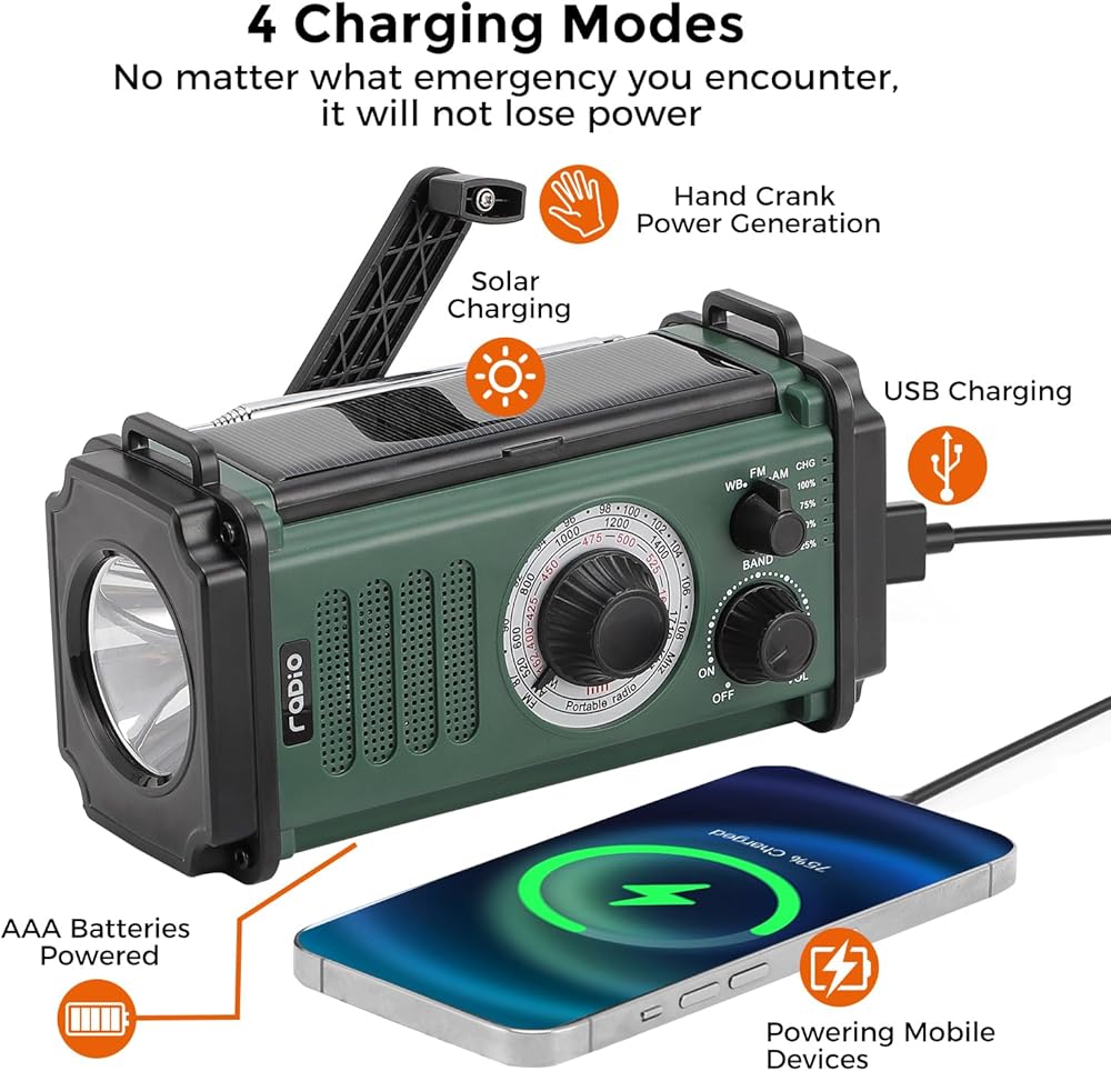 【4 Charging Modes】This revolutionary survival radio supports multiple charging modes: Tcpe-C USB charging, AAA battery powered, solar charging, hand crank charging. Whether you encounter severe weather such as hurricanes, tornadoes, blizzards,tsunami,etc., this hand crank emergency radio will never lose power!