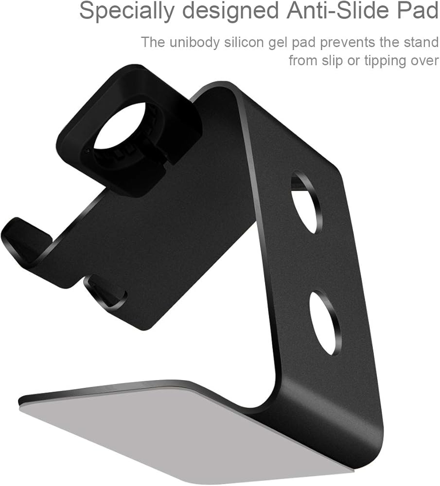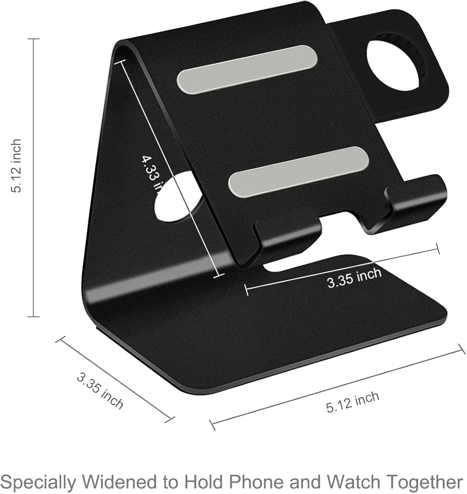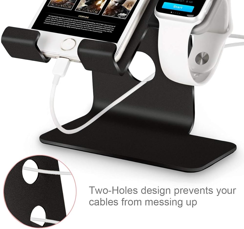 Specially designed rubber holder firmly grips your watch charger without needing to worry about a loose connection; Two round cutouts on the back prevents the cables from messing up, therefore keeping your desk and everything else neatly organized. Works perfectly as watch charging nightstand or office stand for your Watch and Cell Phone.