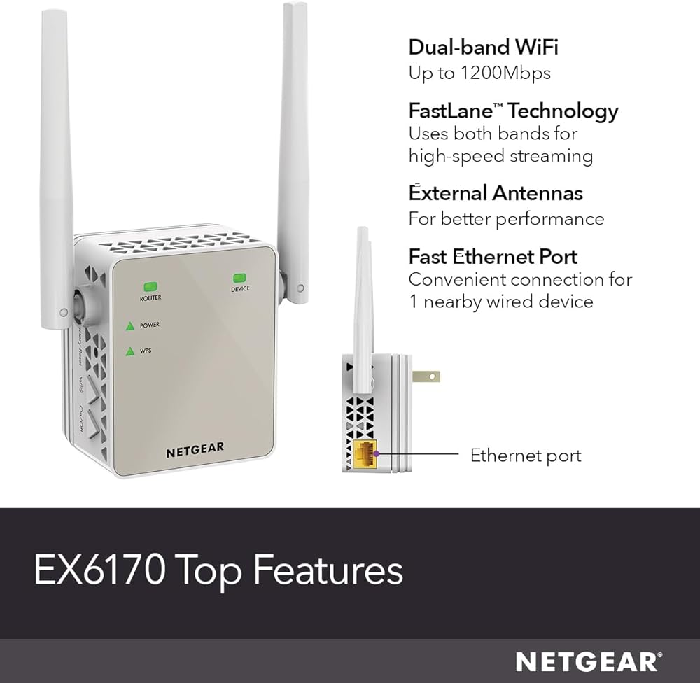 NETGEAR Dual-Band WiFi 5 Range Extender (EX6170) – Coverage up to 1,500 sq. ft., 25 Devices with AC1200 (up to 1200Mbps Speed) – Wireless Signal Repeater - Compact Wall Plug Design – White