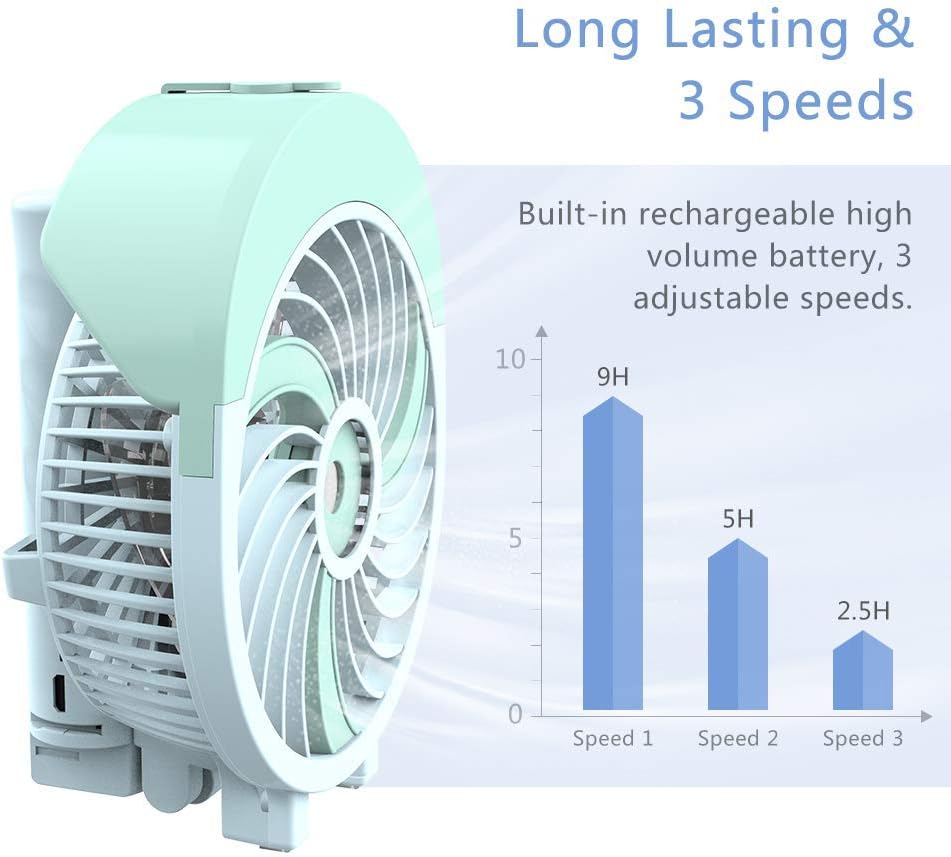 【Long Working Time & Long Durable】: Built-in rechargeable battery, this personal fan with mister can work 9Hrs after fully charge.Moreover, using energy-saving DC Brushless motor, which can work continuously for about 2000 hours, it means that you can keep it for a long time.