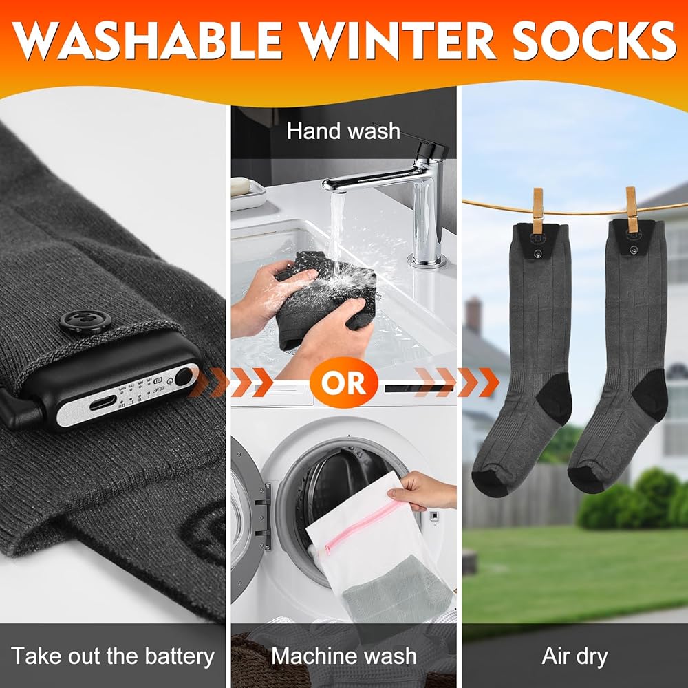 【قابلة للغسل وضرورية للشتاء】: يمكن غسل هذه الجوارب الساخنة في الغسالة أو غسلها يدويًا. فقط تأكد من إزالة البطارية قبل الغسيل. عند استخدام الغسالة، ضعي الجوارب في كيس الغسيل، ثم ضعيها في الغسالة. بالإضافة إلى ذلك، يجب التأكد من أن الجوارب جافة تمامًا قبل تسخينها للاستخدام.
