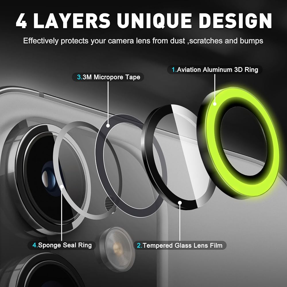 【Full Protection】Made of high-quality alloy and 9H tempered glass, our camera screen protector offers superior durability and strength. The independent metal ring covers each camera lens fully, providing comprehensive protection against drops, scratches, fingerprints, dust, oil, and water stains. Additionally, you can decorate your iPhone with different color lenses, which protects your lens while making your iPhone stand out.