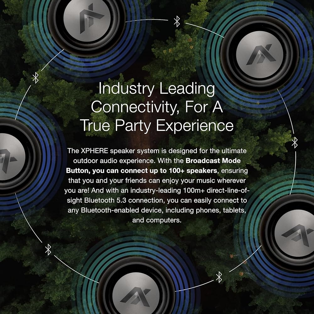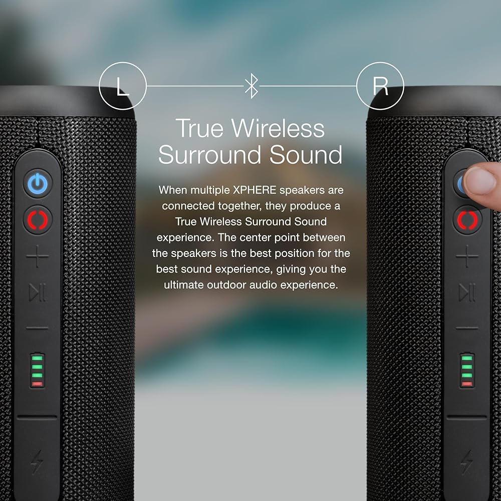 Immersive Outdoor Audio: XPHERE outdoor speakers are your all-in-one solution for outdoor audio enjoyment. With True Wireless Surround Sound, this portable Bluetooth speaker transforms any space into a concert-like setting, perfect for beach outings, hiking adventures, and camping bliss.