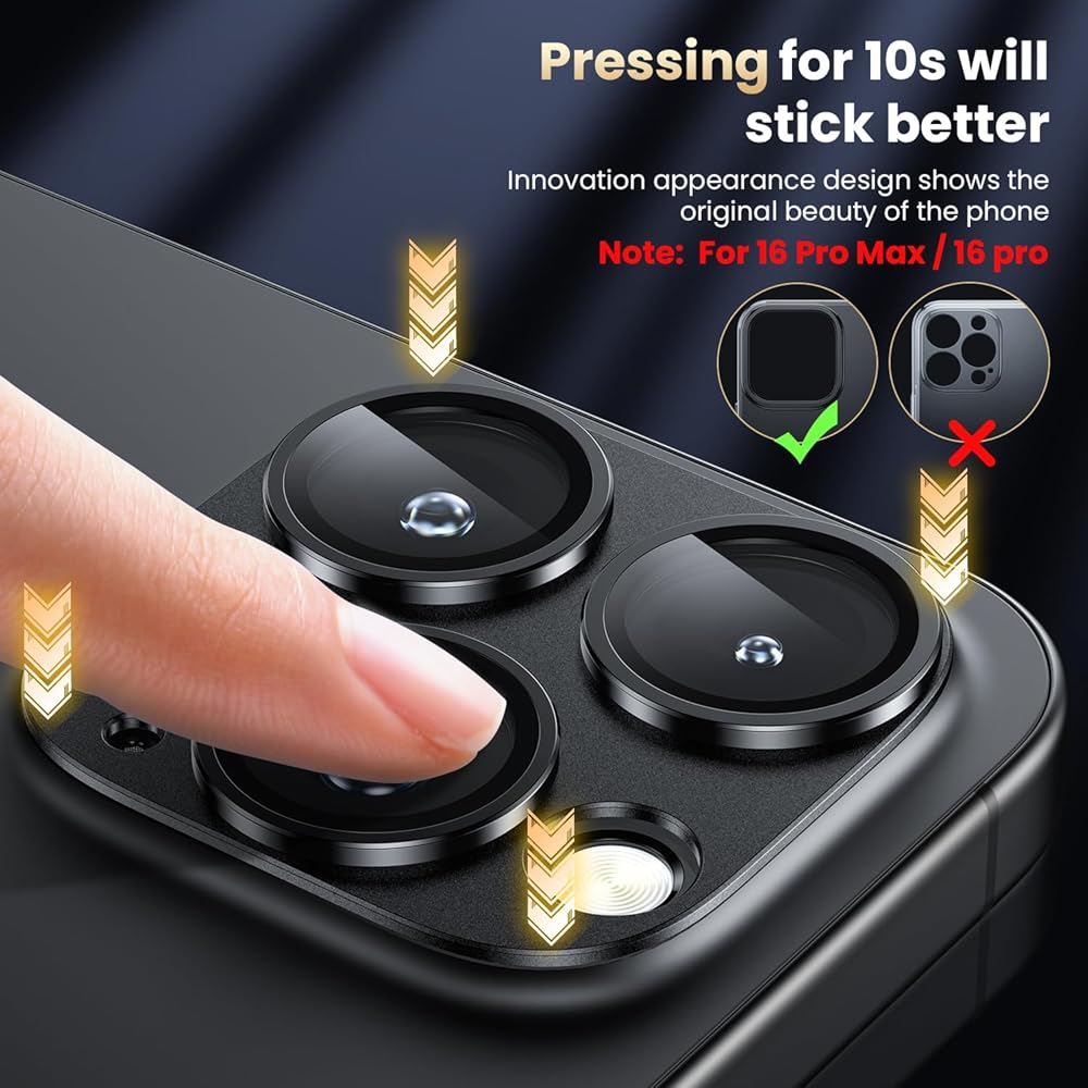 Easy to Install: No tools needed. Just match the protector with the phone camera lens, then stick on the protector and press it securely,the powerful glue will secure the protector on it will not slide off easily. Only design for iphone 16 pro max / iphone 16 pro, compatible with 99% case. If the lens cover for your phone fell off/broken,please feel free to contact us. Then we will resend a new one to you.