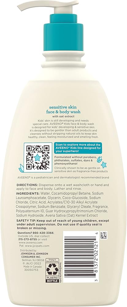 From a pediatrician- & dermatologist-recommended brand, Aveeno Kids Sensitive Skin Face & Body Wash makes a perfect addition to your kids' daily skincare routine. To use, dispense onto a wet washcloth or hand & apply to face & body. Lather & rinse