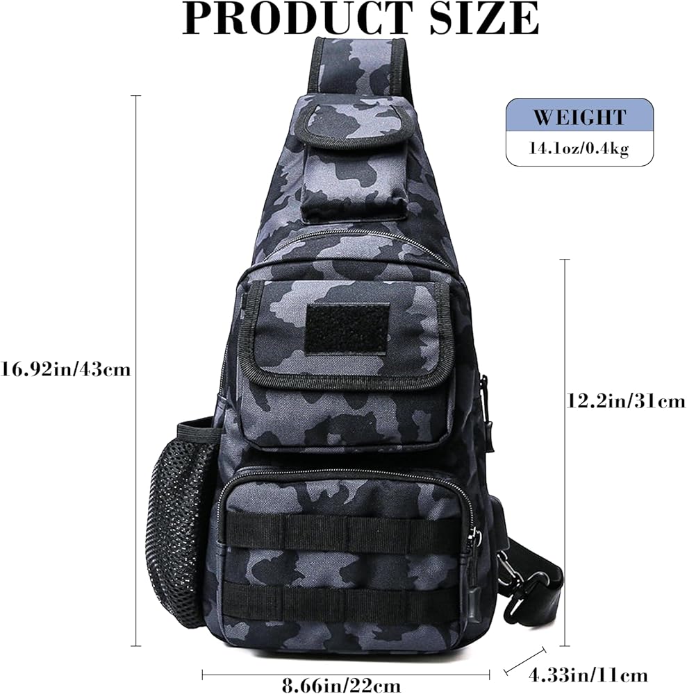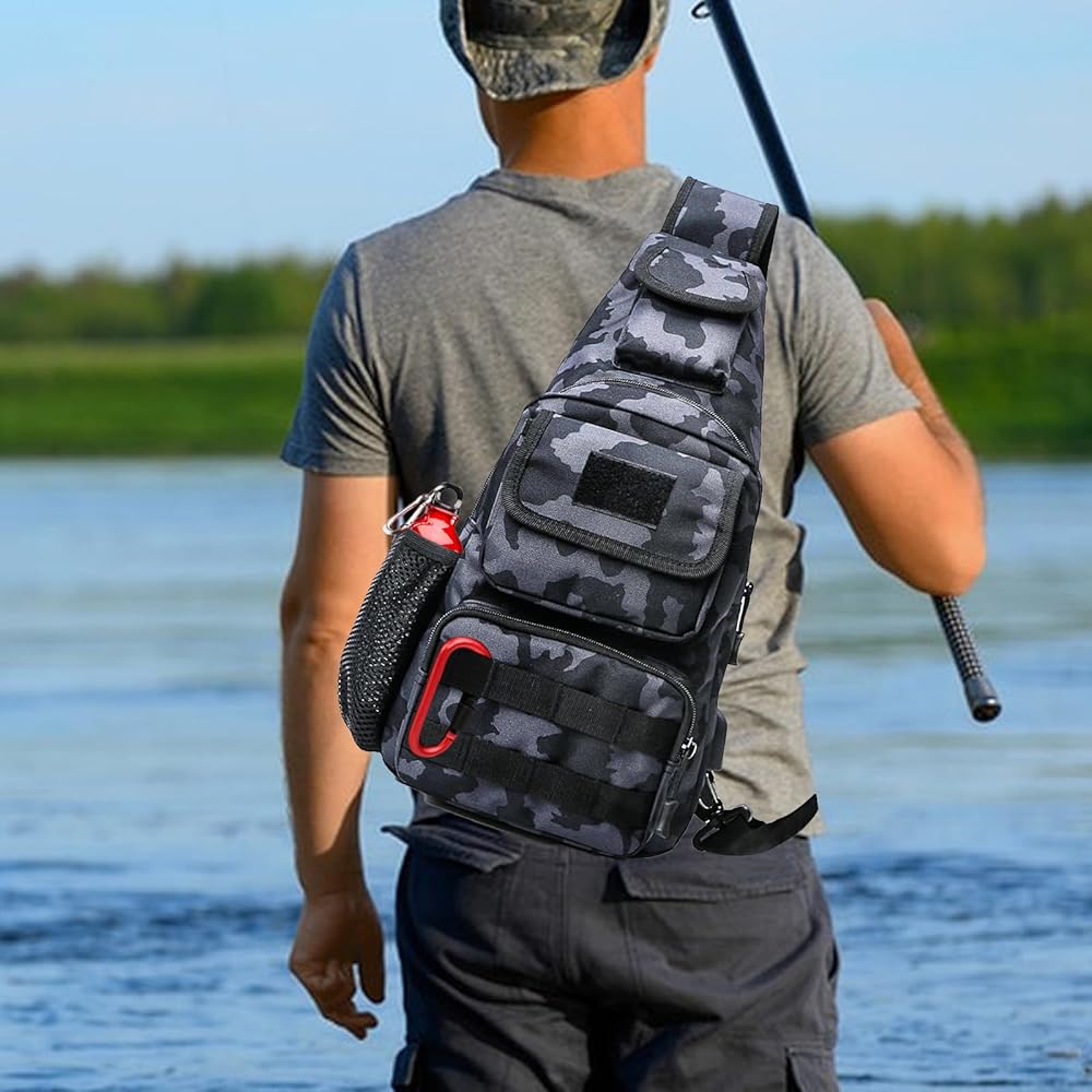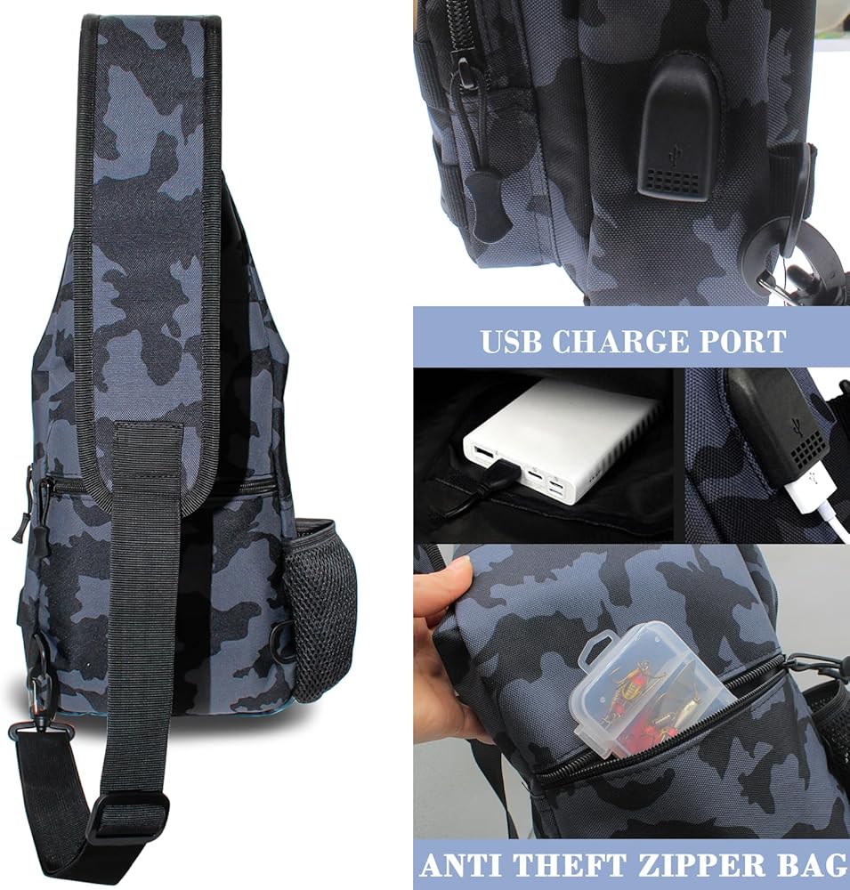 Fishing Tackle Sling Bags Small Chest Bag with Earphone Hole and USB Charging Port, Weatherproof Shoulder Crossbody Backpack for Fly Fishing, Camping, Hiking, Outdoor Sports