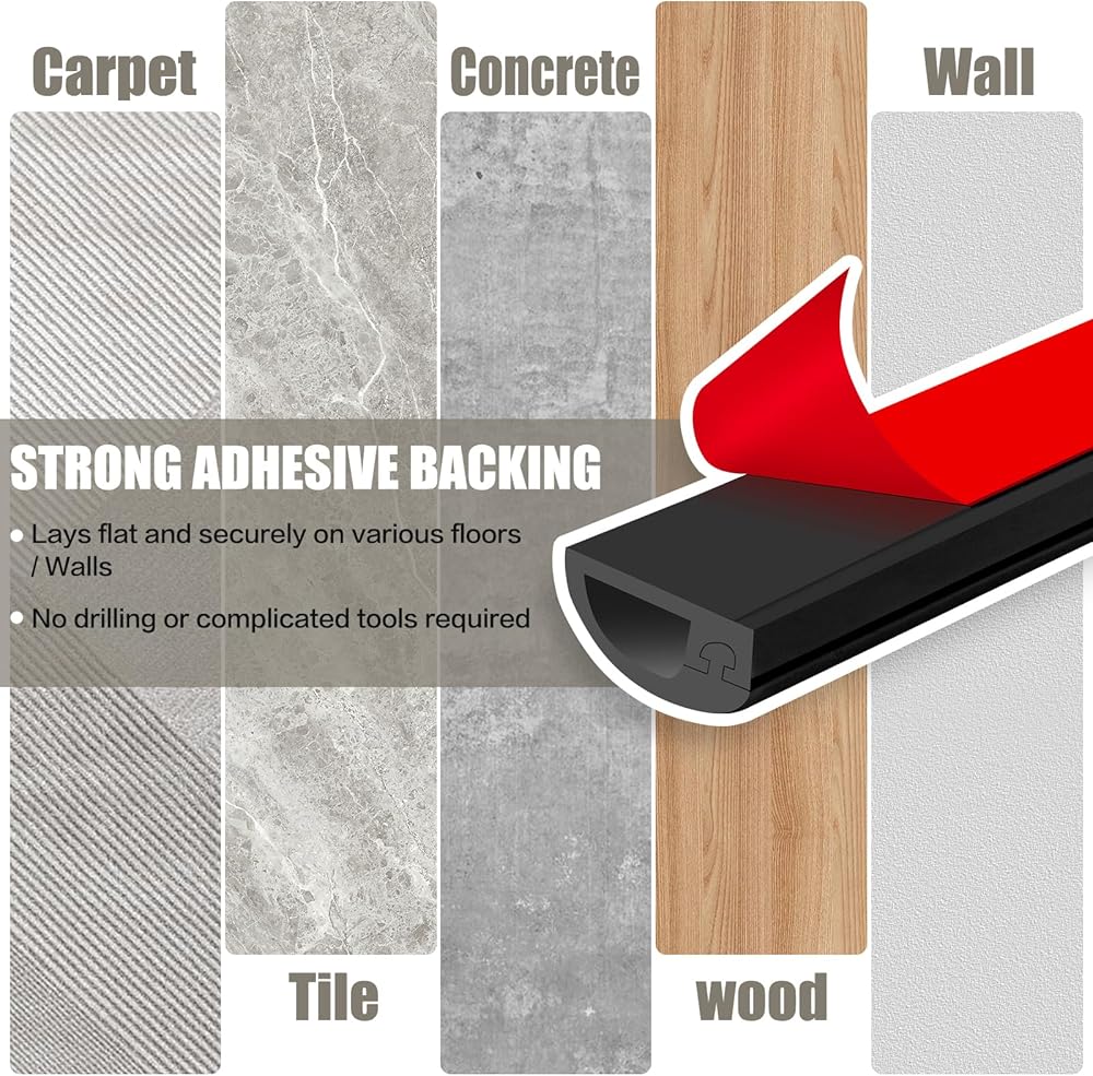 TOOL-FREE INSTALLATION: The JAHOMFAI Cord Cover comes with a self-adhesive backing, making it easy to peel and stick securely onto walls and flooring surfaces, including hardwood, carpet, tile, and concrete, without causing any damage. It sits flat and stays firmly in place, ensuring your space remains safe and clutter-free