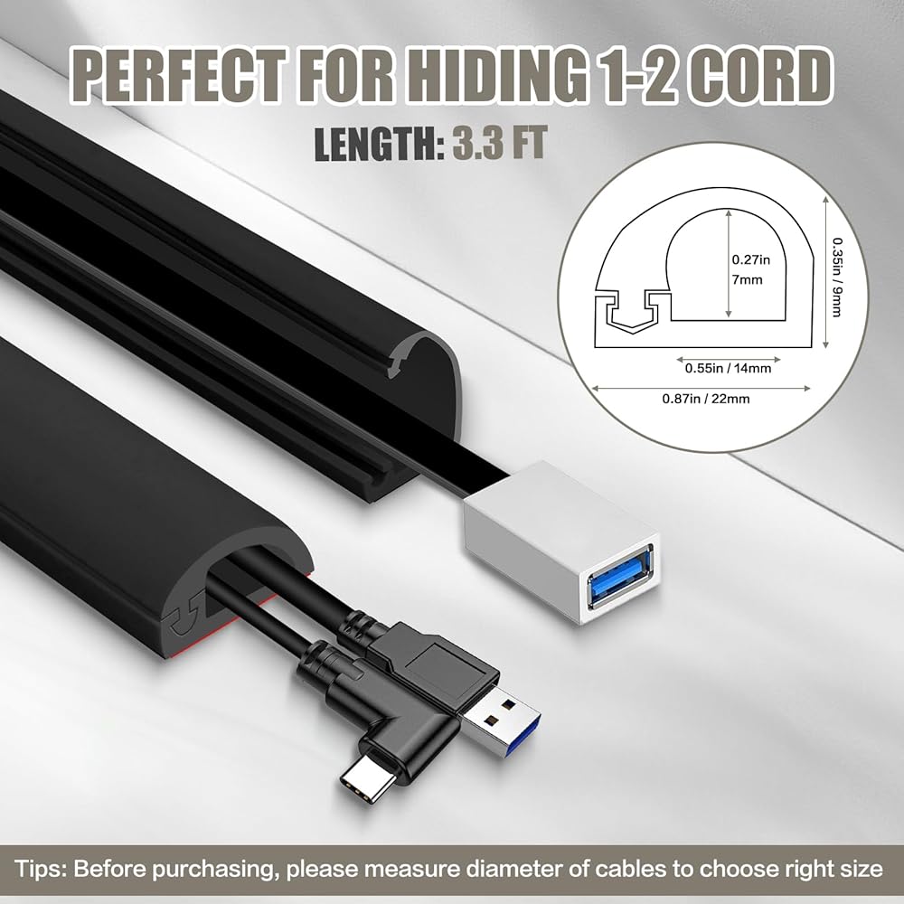 LARGE CAPACITY: JAHOMFAI Cable hider is perfect for hiding up to 3 USB cables or 2 HDMI cable with its 0.89 inch width and 0.44 inch height. In addition, It's also ideal for hiding commonly used cables like wall-mounted TV power cords and speaker wires. Please check the outer diameter of your cords or cables before placing your order