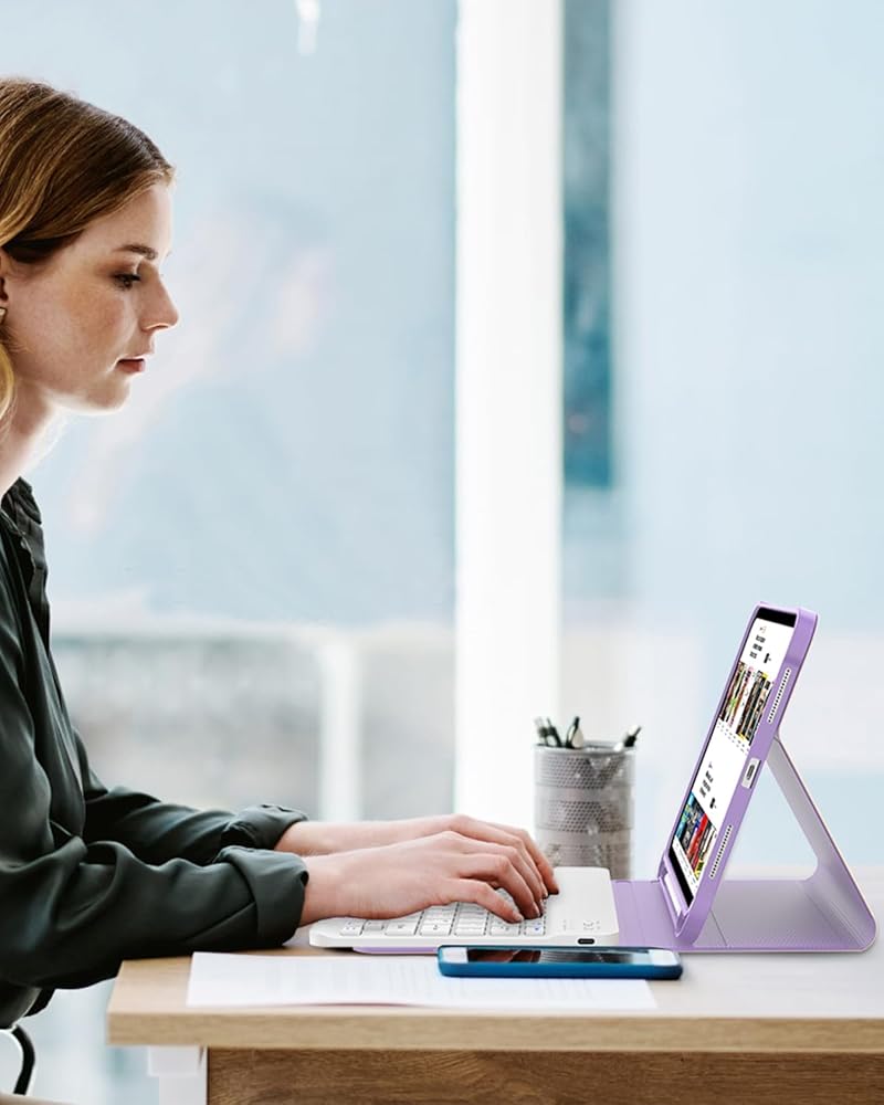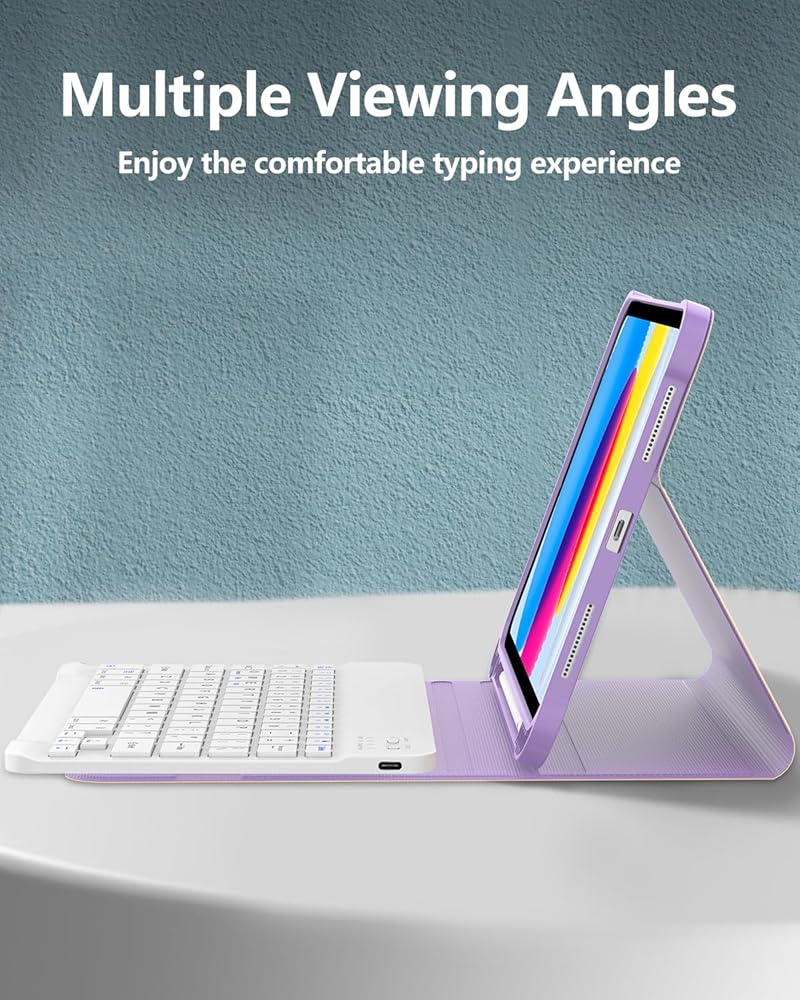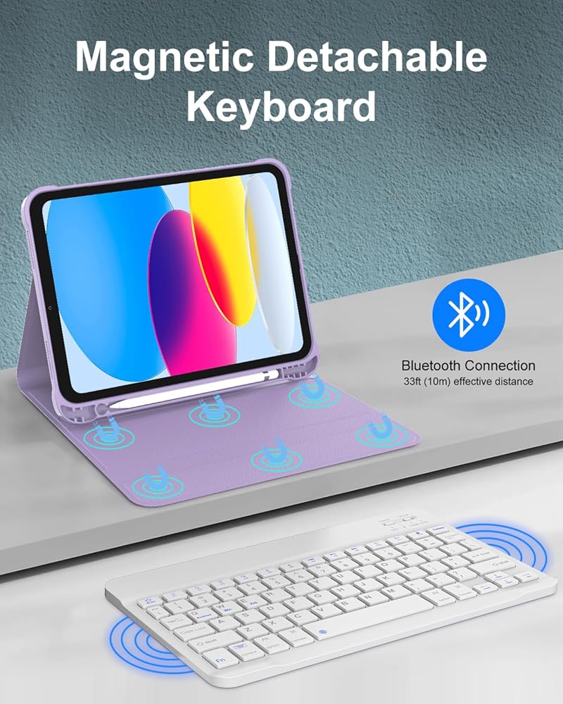 7 Colors Backlit Keyboard for iPad 10th Generation: The keyboard has 7 backlight colors and 3 brightness levels that allow you to type comfortably in the dark, you can choose your favorite color and the appropriate brightness level. This detachable Bluetooth keyboard can be magnetically attach to the iPad protective case and can be removed when not needed. Bluetooth connection is also very simple and fast.