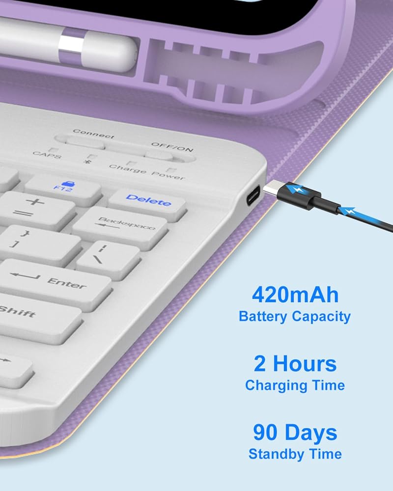 Rechargeable Keyboard & Auto Sleep/Wake Magnetic Case: The keyboard USB charge cables are attached with the parcel. After 2-3 hours of full charge, the wireless keyboard standby for 90 days (turn off the backlit). When you open or close this protective case, it will automatically wake up or sleep the iPad, thereby helping to extend the battery life of the iPad.