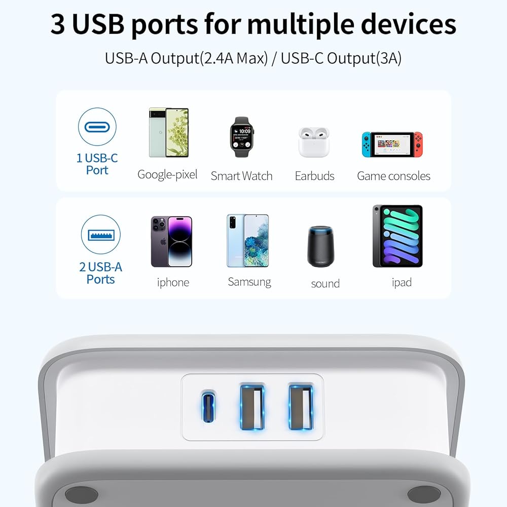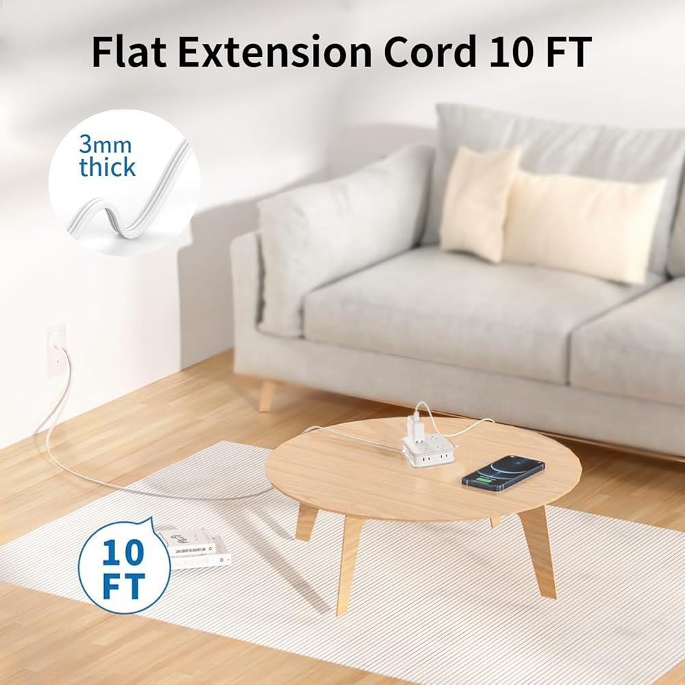 【 Extension Cord with Multiple Outlets & USB Ports】With 8 outlets and 3 USB ports(1 USB C), the power strip extension cord can charge up to 11 devices, so you don't have to worry about the lack of charging ports! The USB-C port has a maximum power of 5V/3A and can charge your iPhone 12 up to 40% in half an hour, so there's no waiting! 【 Long Extension Cord 10 FT 】The 3 prong extension cord comes with a 10 feet long cord, making it the ideal solution for getting away from your devices and room sockets! The low profile extension cord can be cleverly hidden under carpets and through doors without the fear of tripping over it!