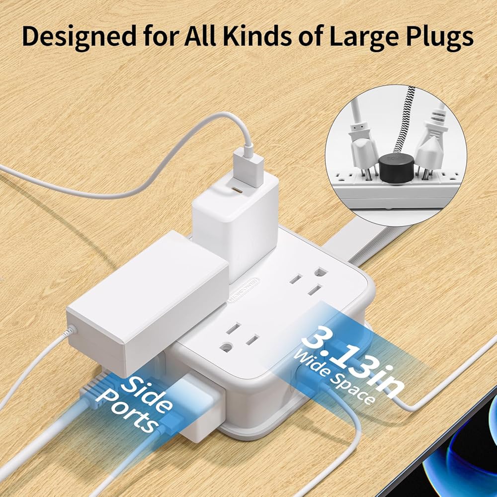 【 Wider Spacing & 3-Side Design 】Top AC outlet spacing is 3.13in, the flat plug extension cord can be plugged into multiple large adapters at the same time without blocking each other, and the 3-sided design allows you to charge from multiple directions at the same time for a neater desk!