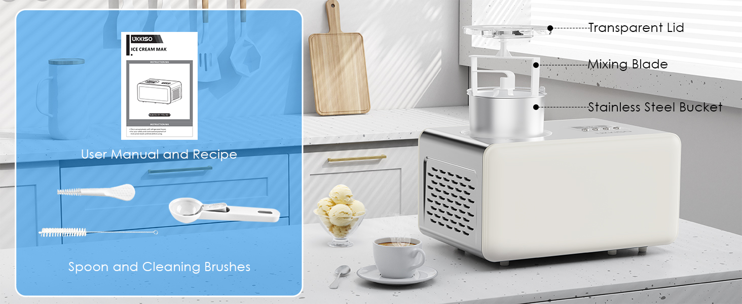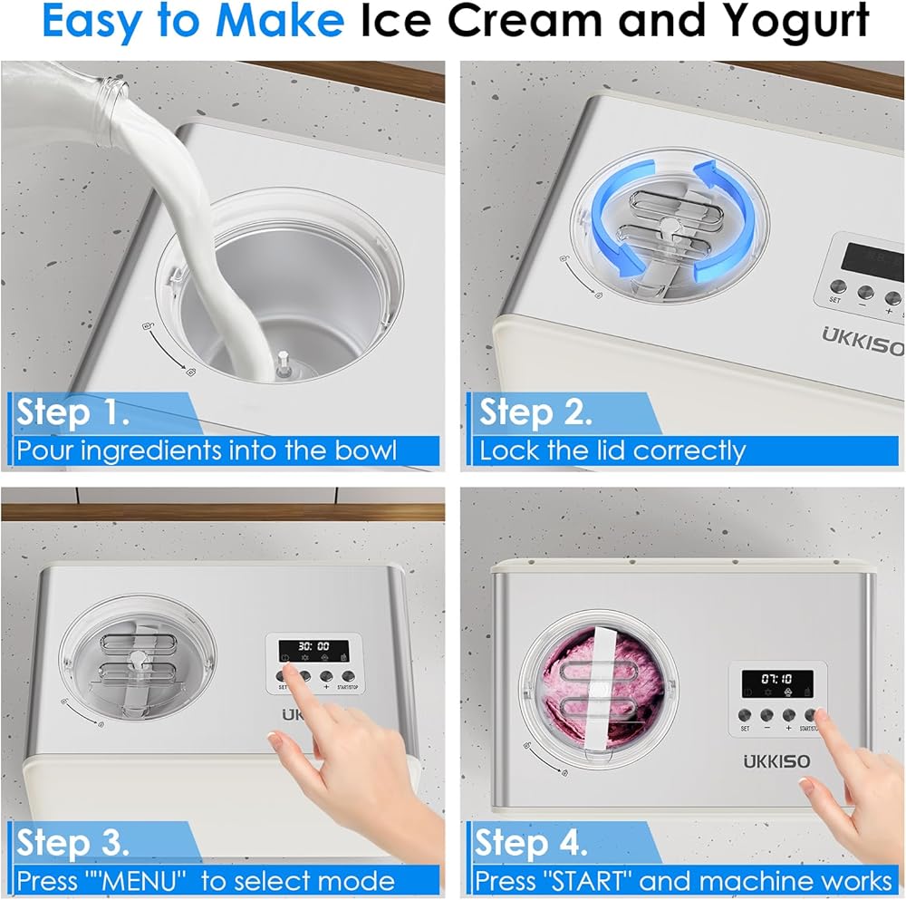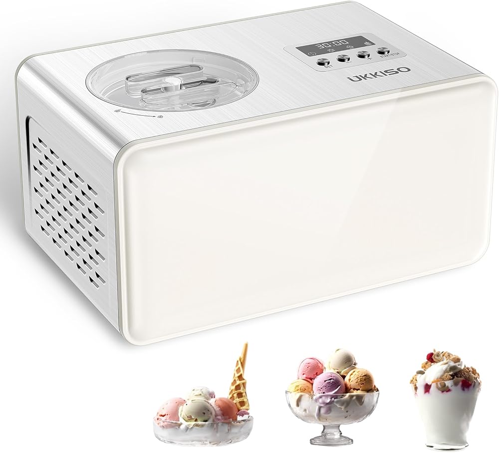 🍦【Quick & Convenient】UKKISO Powerful 150W built-in compressor freezer allows for continuous use without the inconvenience of having to pre-freeze. Allows you to make tasty ice cream, yogurt, sorbet and gelato within a short time ever you want