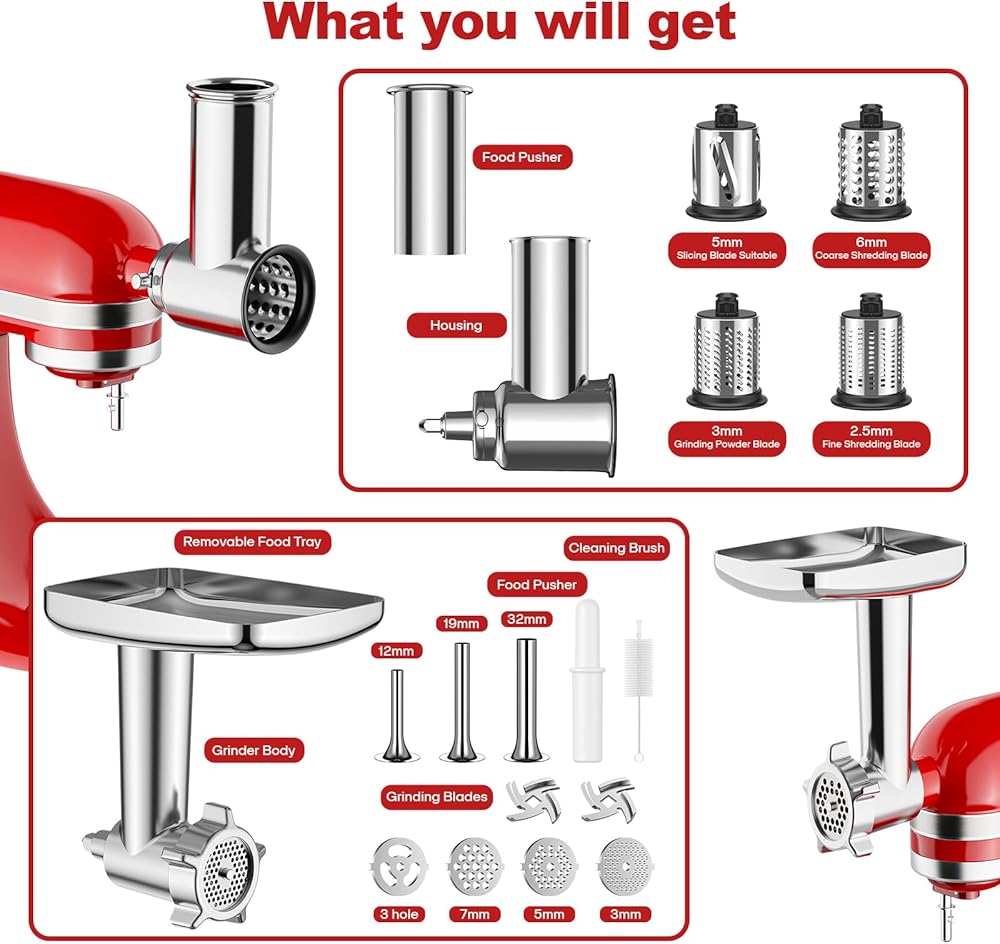 Metal Construction Meat Grinder: The meat grinder attachment for kitchenaid is aluminum metal parts, precision-made by machine, secure assembly easily and grinding efficiently. Comes with 2 cutting blades, 4 different sizes grinding plates, 1 set kebbe meatball attachment, plus 3 sizes sausage fillers, to meet all your cooking needs.