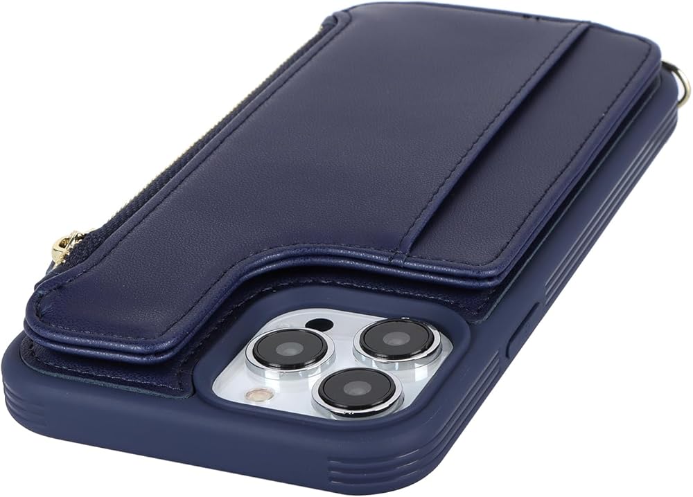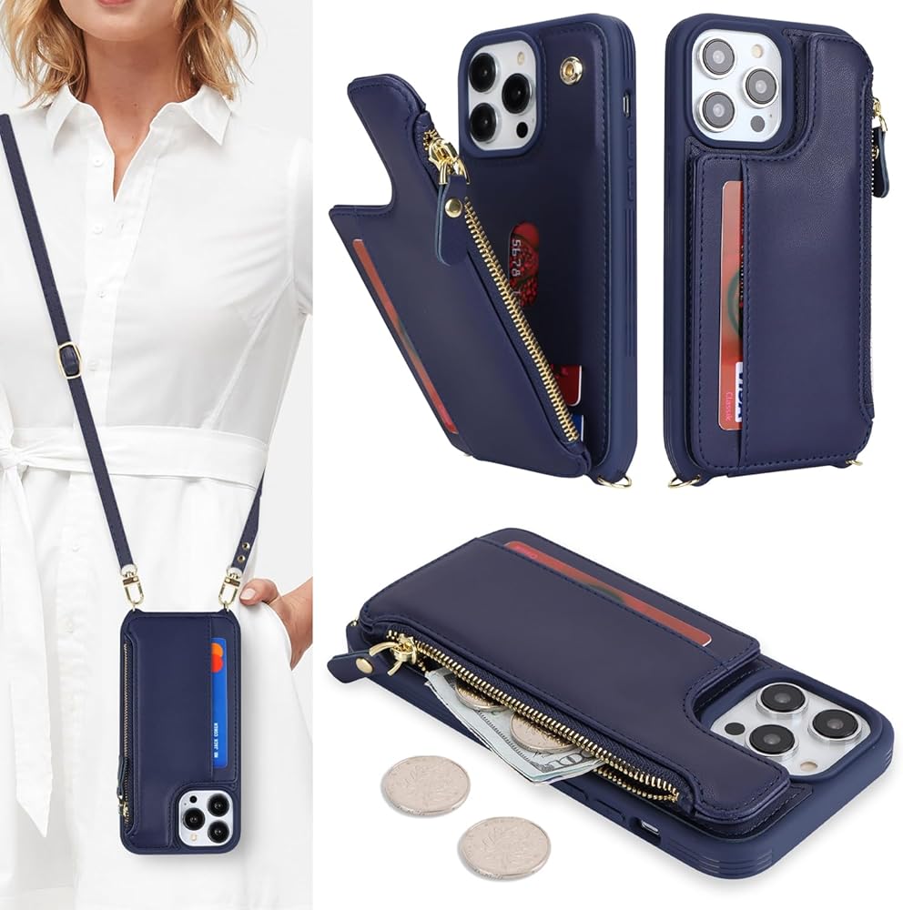 Cavor for iPhone 15 Pro Wallet Case with Card Holder for Women, for iPhone 15 Pro Case with Strap,Crossbody and Wristlet Zipper Pocket Phone Cover-Blue