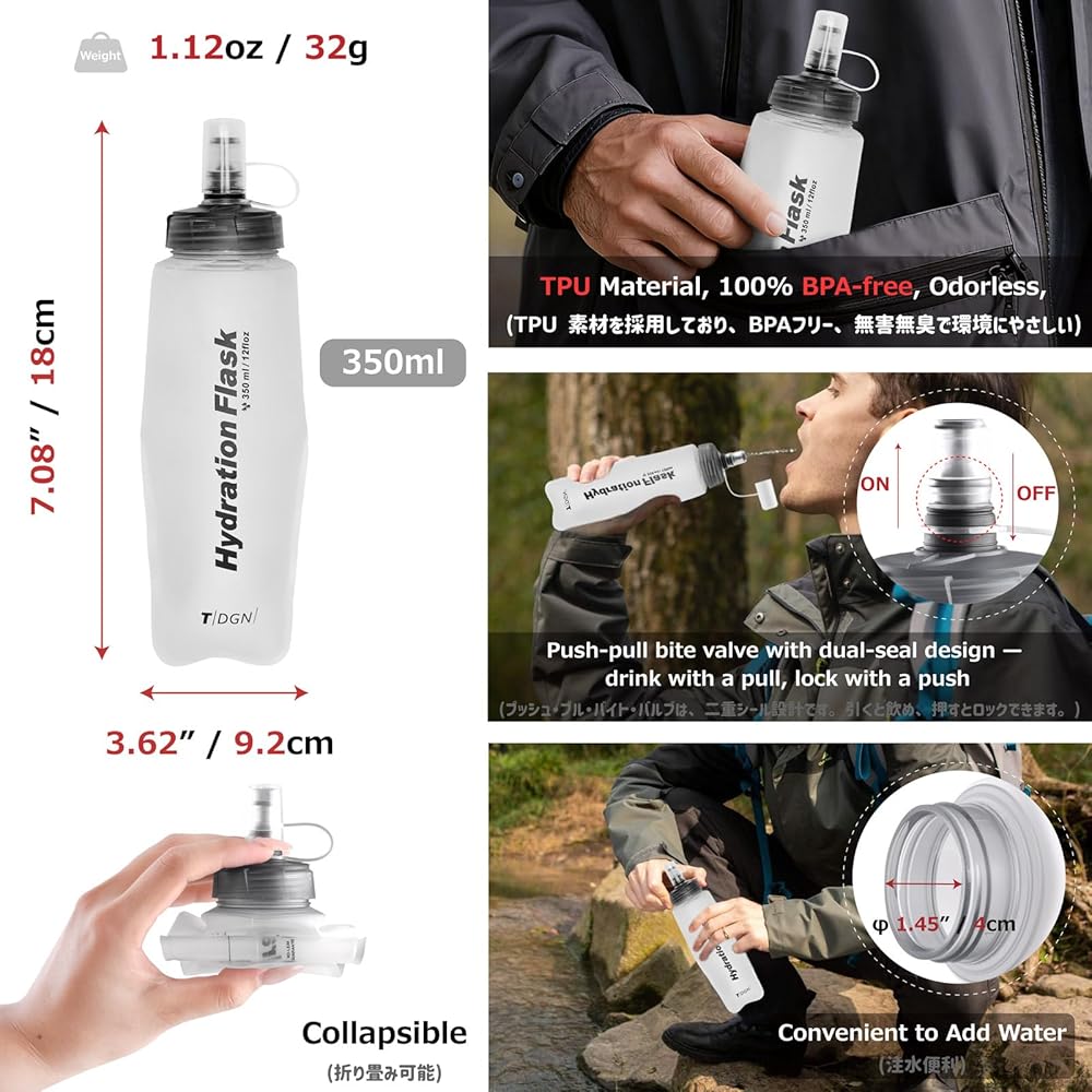 زجاجة الترطيب: مجهزة بزجاجات مياه ناعمة سعة 500 مل، زجاجات الترطيب عالية الجودة مصنوعة من مادة البولي يوريثين الحراري وهي خالية من البيسفينول. تتميز زجاجات الترطيب بوظيفة كاملة تتحمل الضغط ومقاومة للتسرب، مما يضمن كمية كافية من الماء في مختلف الأنشطة الخارجية