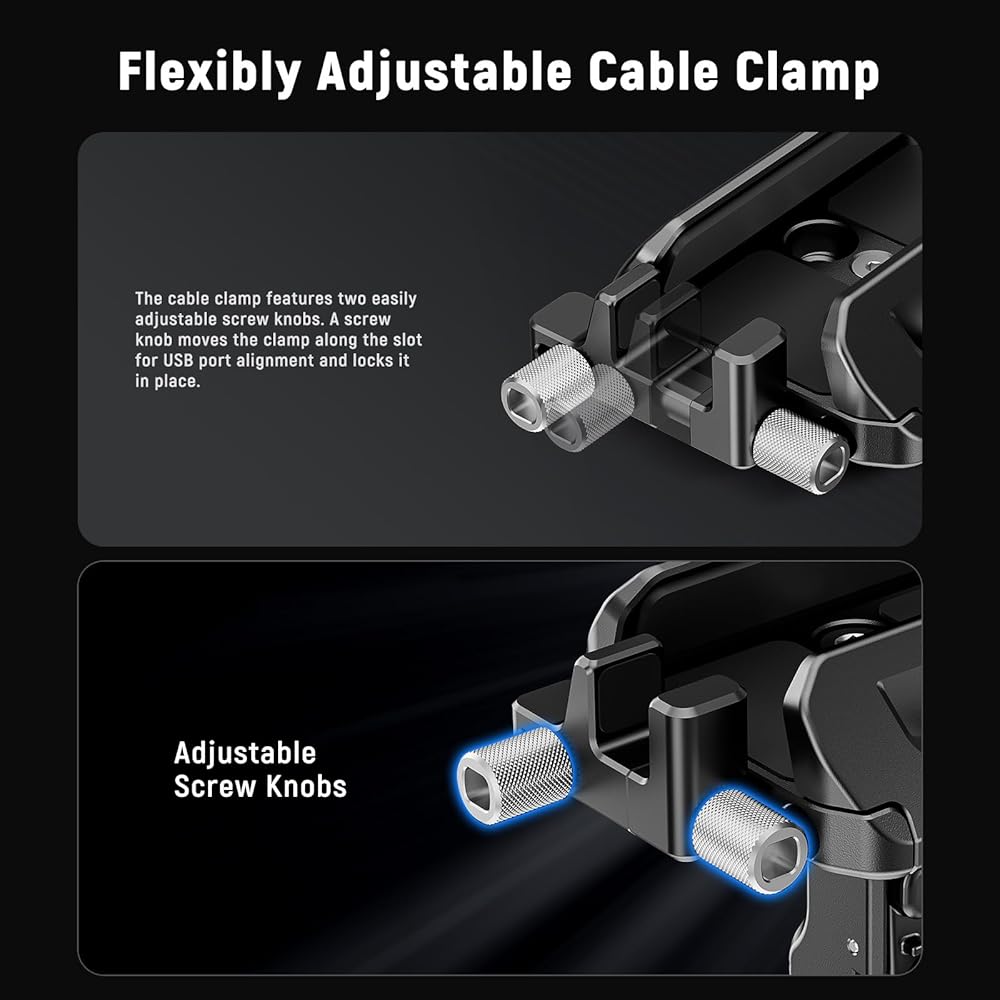 【Flexibly Adjustable Cable Clamp】 The cable clamp features two easily adjustable screw knobs. A screw knob moves the clamp along the slot for USB port alignment and locks it in place. Another screw knob secures the cable for a stable signal transfer