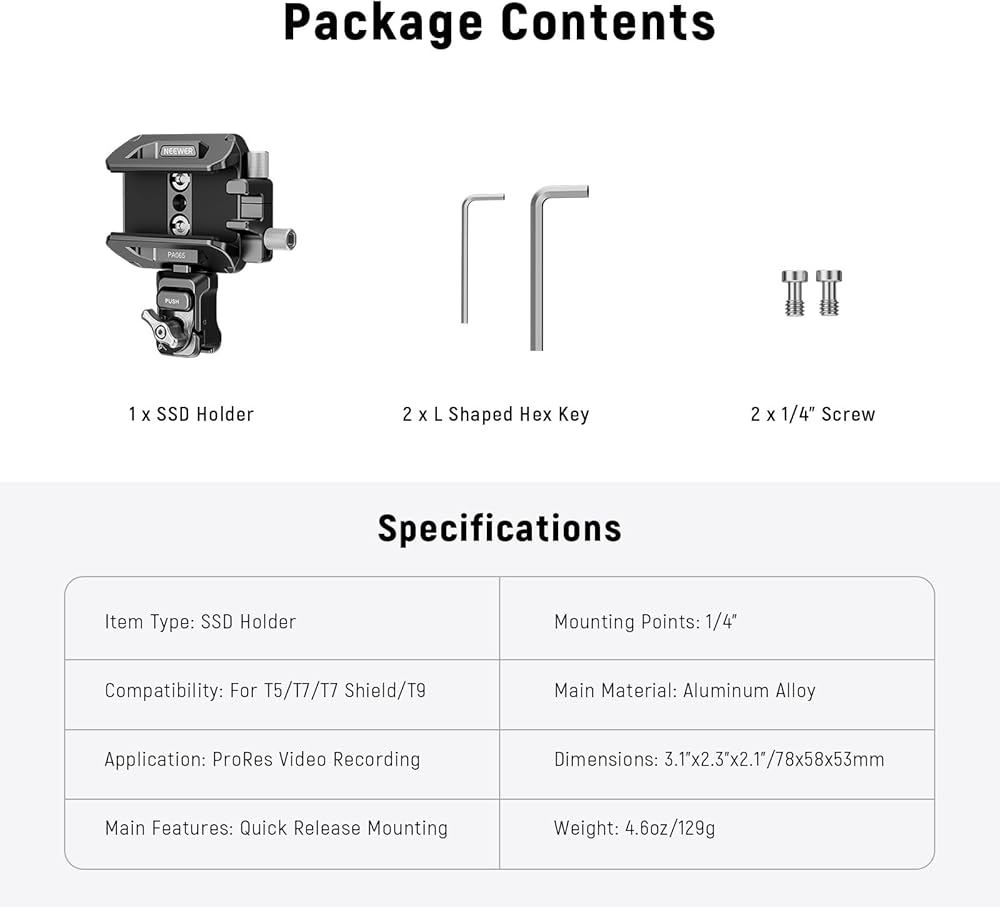 【Three SSD Installation Positions】 The quick release clamp supports horizontal and vertical mounting directions (for vertical mounting, detach the quick release clamp, then reattach it to the side of the SSD holder). Use the two included 1/4" screws to attach the SSD holder to a universal phone cage (NEEWER PA009/PA017). Compatible with SmallRig phone cages as well