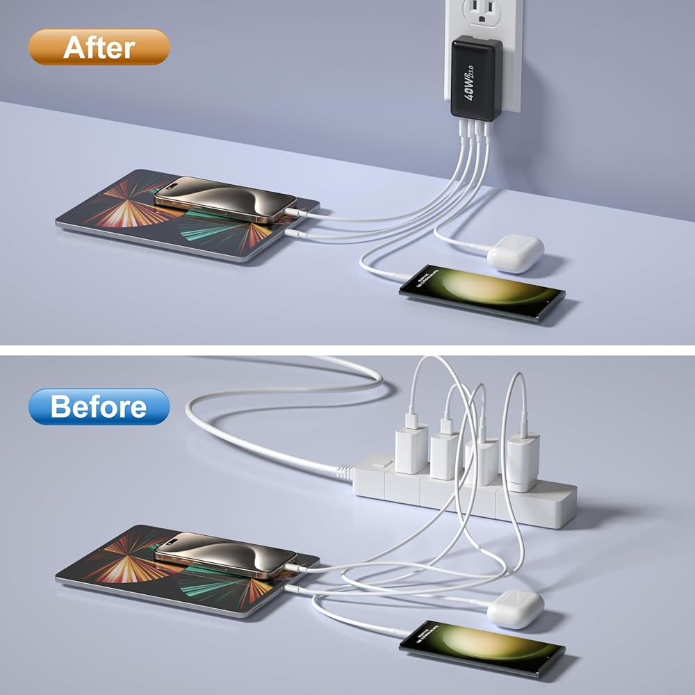 Multi-ports USB C Wall Charger: This USB C wall charger provide 40W strong power via 2 USB-C ports and 2 USB-A ports,efficiently charging 4 devices simultaneously, works for smartphones, tablets, earbuds, headphones, smartwatches, etc.