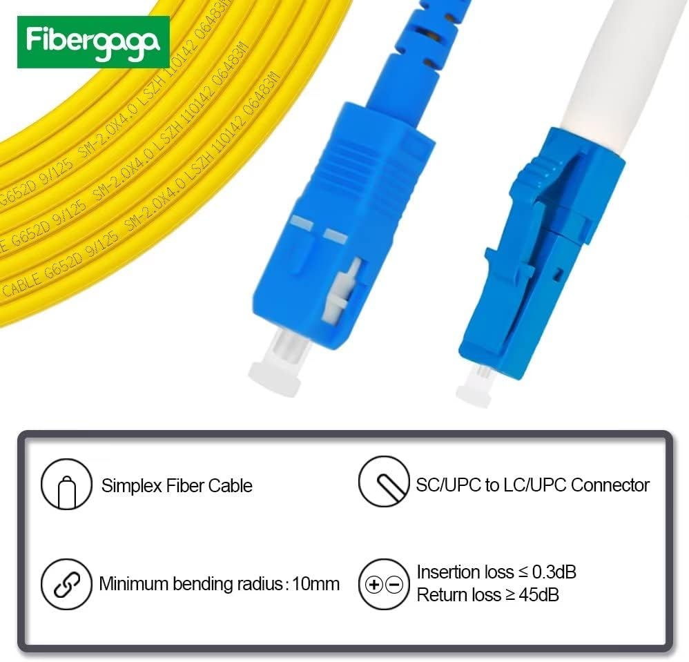 fiber information: 1m(3ft) SC to LC Fiber Patch Cable OS2, SC cable single mode is 9 / 125 μ m. 10GBASE-L (1310 nm), 10GBASE-E (1550 nm). Sheath material: LSZH fiber Color: yellow. The outer diameter is 2.0mm